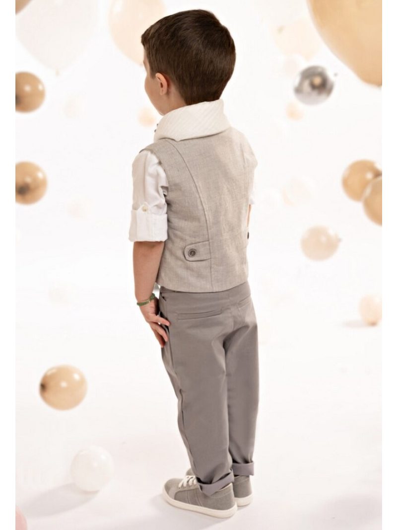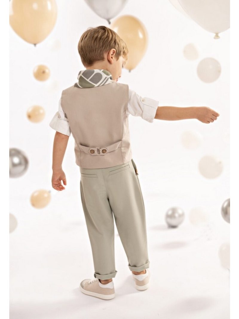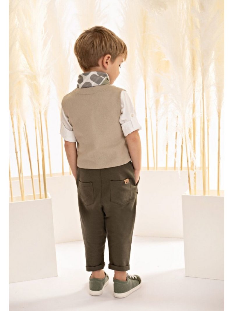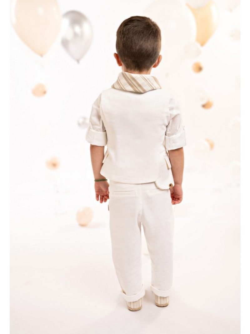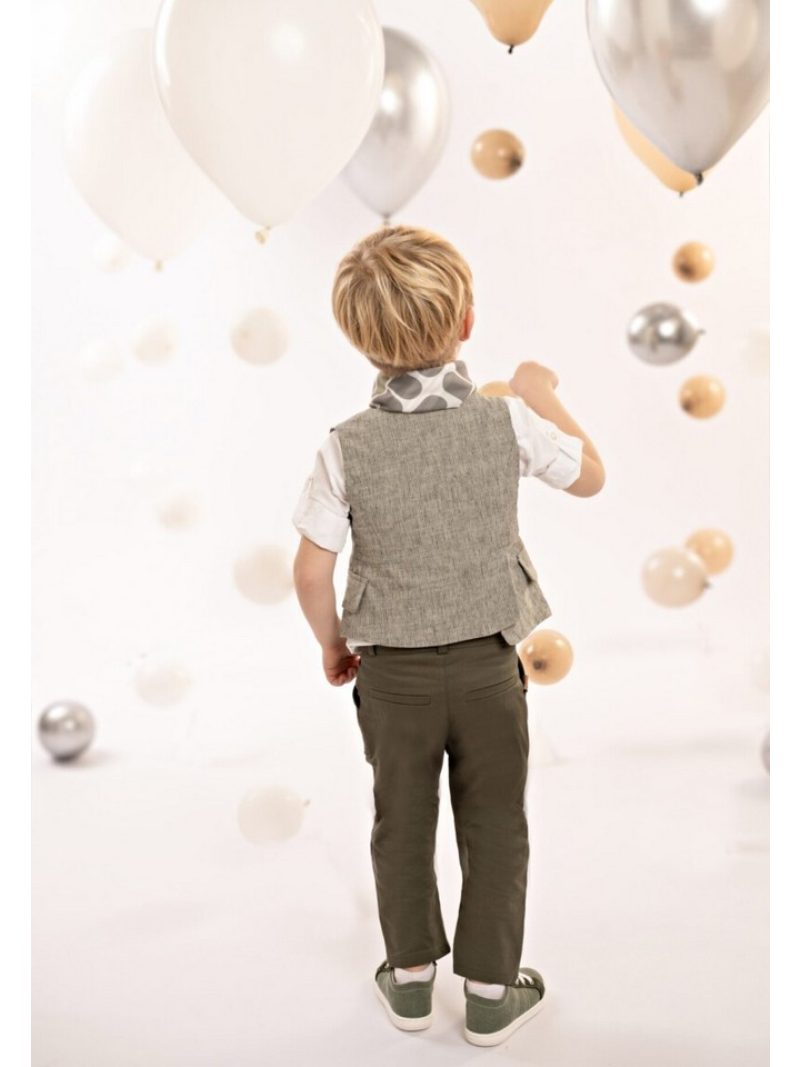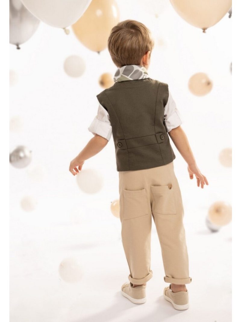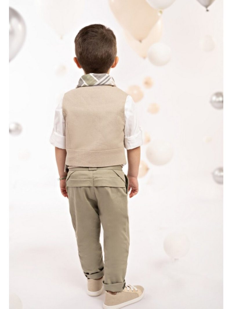 Ένα σύνολο που αποπνέει κομψότητα και φινέτσα. Το δίπιετο παντελόνι, με τσέπες φιλέτα, και το γιλέκο σε κλασική γραμμή, με έξυπνα κοψίματα, είναι φτιαγμένα από υπέροχο 100% λινό ύφασμα σε χρώμα ευκαλύπτου. Το βαμβακερό πουκάμισο σε off white απόχρωση με κλασικό γιακά, ολοκληρώνει την απλότητα και την κομψότητα του συνόλου. Το σετ αναδεικνύεται με το ασορτί δίχρωμο παπιγιόν, το φουλάρι σε off white από βαμβακερή υφαντή γάζα, τη ζώνη από μπεζ κορδόνι και το ψάθινο καπέλο ή τραγιάσκα (ανάλογα με την προτίμηση), προσφέροντας μια αψεγάδιαστη εμφάνιση.