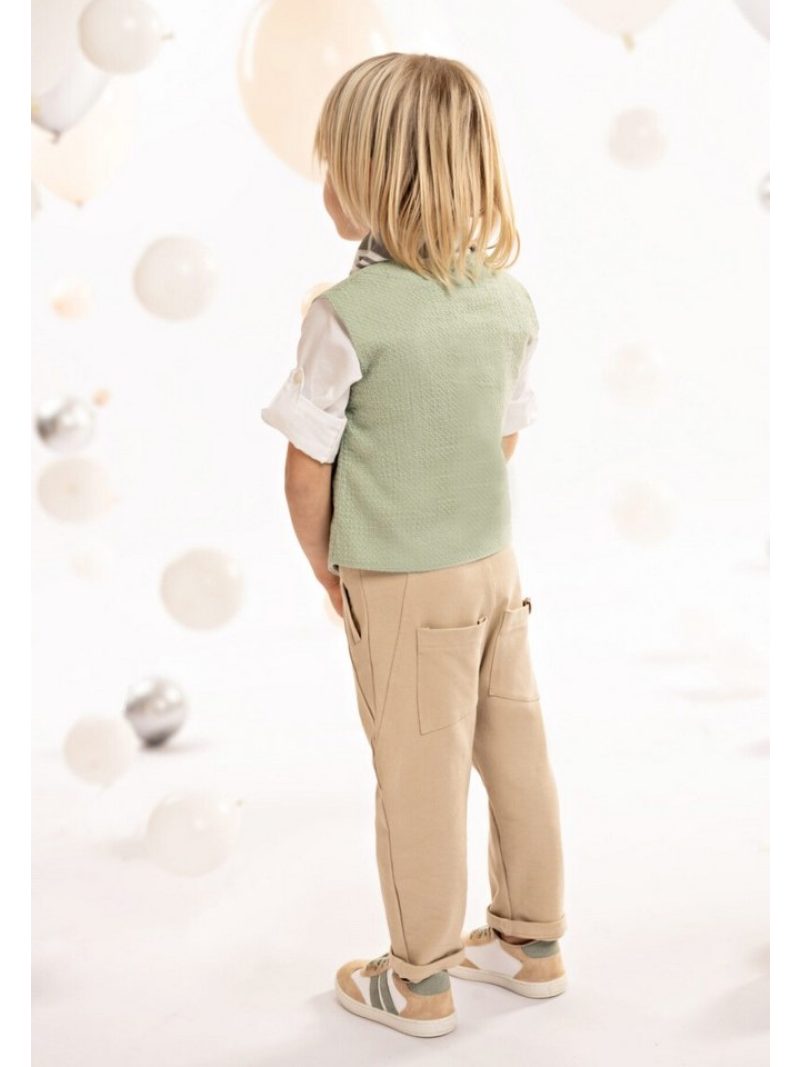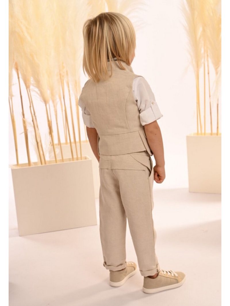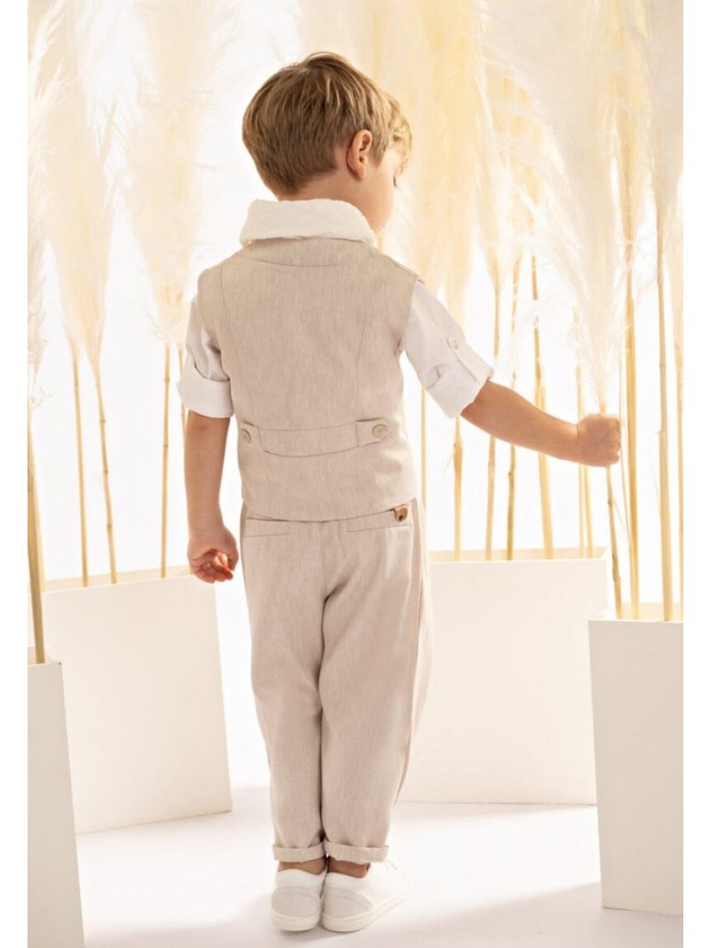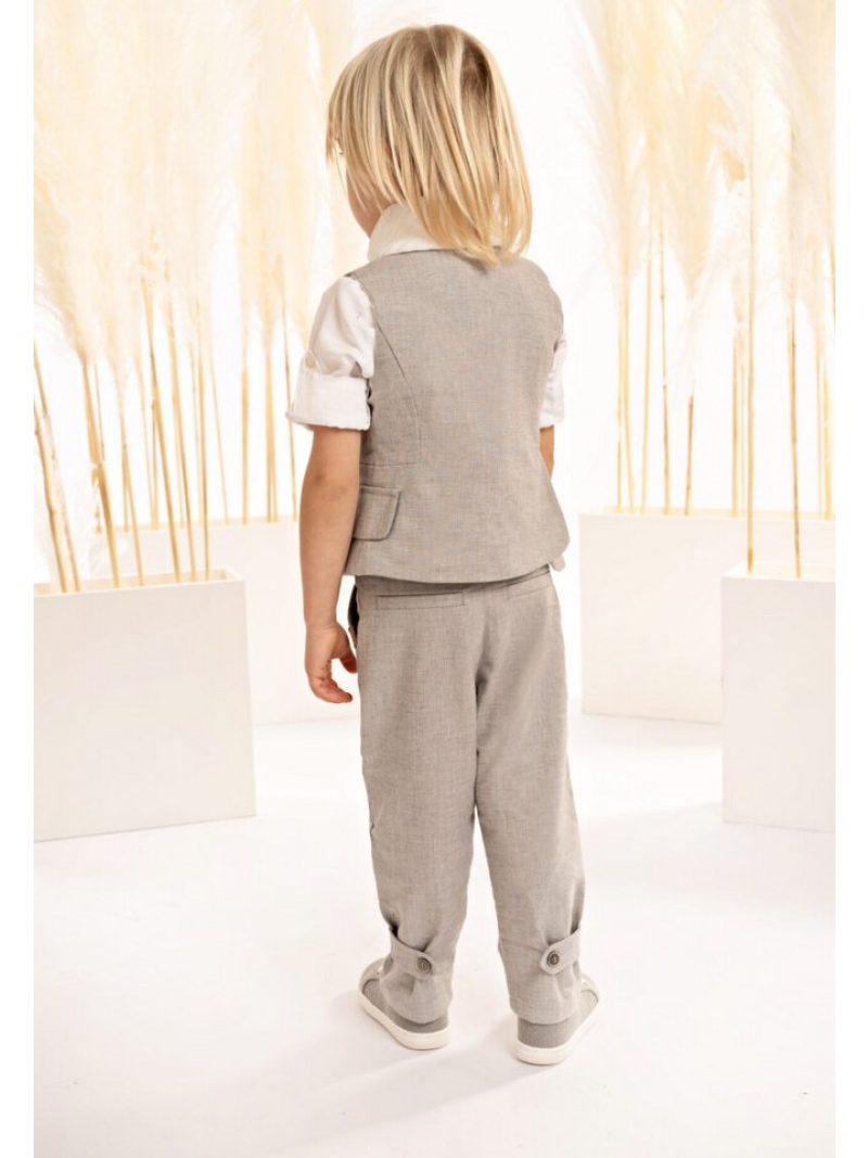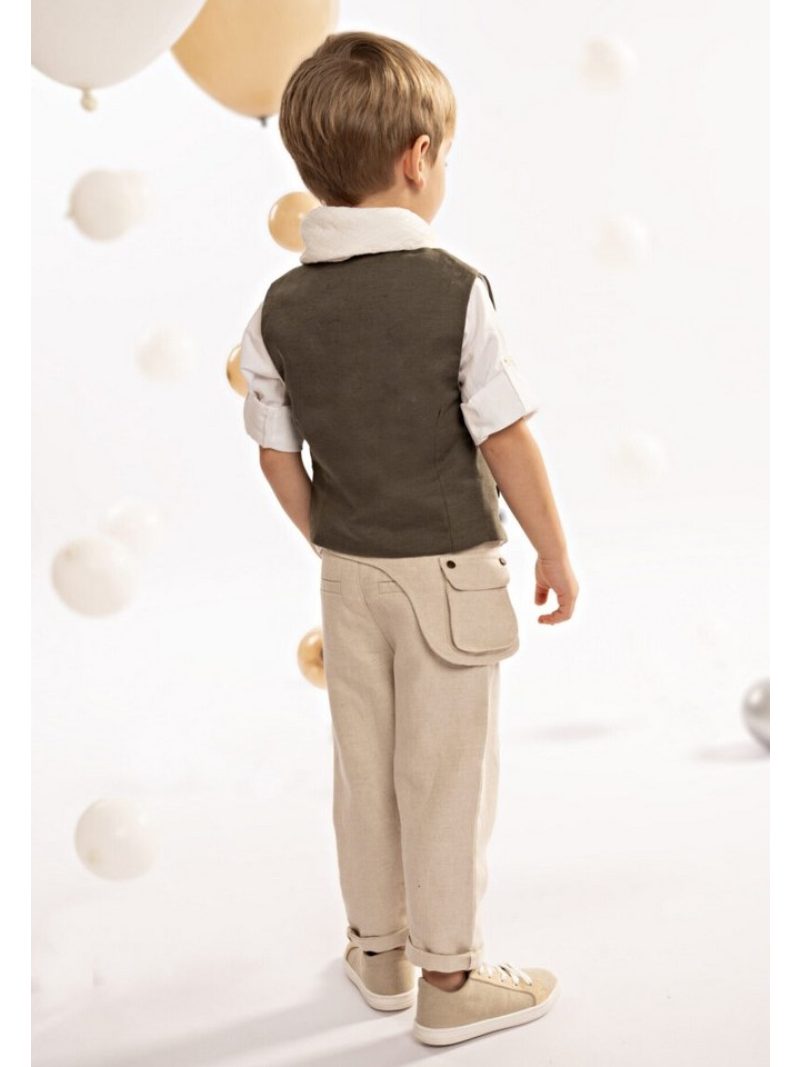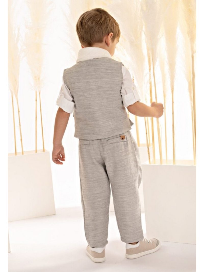 Ένα σύνολο που αποπνέει κομψότητα και φινέτσα. Το δίπιετο παντελόνι, με τσέπες φιλέτα, και το γιλέκο σε κλασική γραμμή, με έξυπνα κοψίματα, είναι φτιαγμένα από υπέροχο 100% λινό ύφασμα σε χρώμα ευκαλύπτου. Το βαμβακερό πουκάμισο σε off white απόχρωση με κλασικό γιακά, ολοκληρώνει την απλότητα και την κομψότητα του συνόλου. Το σετ αναδεικνύεται με το ασορτί δίχρωμο παπιγιόν, το φουλάρι σε off white από βαμβακερή υφαντή γάζα, τη ζώνη από μπεζ κορδόνι και το ψάθινο καπέλο ή τραγιάσκα (ανάλογα με την προτίμηση), προσφέροντας μια αψεγάδιαστη εμφάνιση.