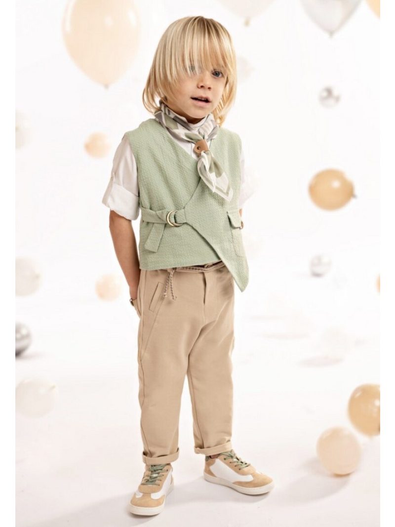 Ένα σύνολο που ξεχωρίζει για τις ιδιαίτερες γραμμές και τον κομψό συνδυασμό αποχρώσεων. Το παντελόνι, με το μοναδικό κόψιμο στο πίσω μέρος, είναι κατασκευασμένο από twill βαμβακερό ύφασμα σε mint απόχρωση, ενώ το σταυρωτό γιλέκο με λοξό κούμπωμα και φαρδύ μονό πέτο σε μπεζ βαμβακερό ύφασμα προσθέτει μια ξεχωριστή σχεδιαστική πινελιά. Το βαμβακερό πουκάμισο σε off white απόχρωση με τον κλασικό του γιακά δένει αρμονικά με το παπιγιόν και το personalized φουλάρι με γεωμετρικά σχέδια σε μπεζ-λαδί τόνους. Το σύνολο ολοκληρώνεται με τη ζώνη από μπεζ μελανζέ κορδόνι και το ψάθινο καπέλο ή τραγιάσκα (ανάλογα με την προτίμηση) δημιουργώντας ένα άψογο αποτέλεσμα.