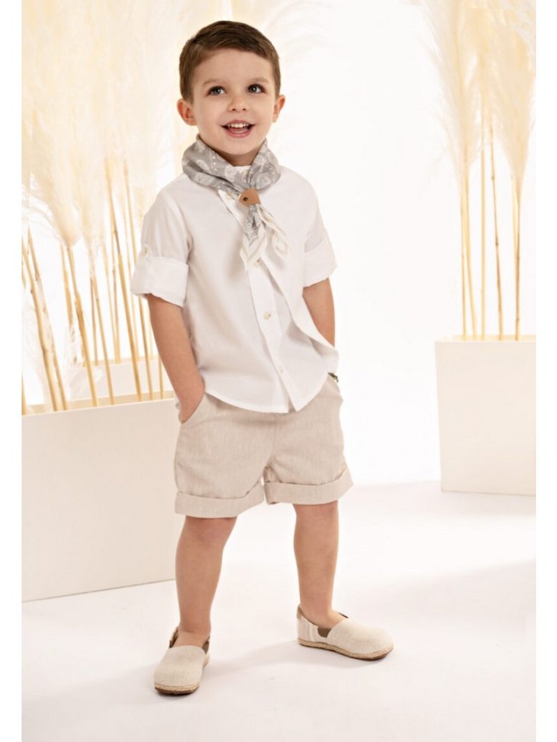 Ένα υπέροχο σύνολο που συνδυάζει άνεση και casual κομψότητα. Η βερμούδα σε loose γραμμή από μπεζ μελανζέ τεχνικό ύφασμα και το βαμβακερό πουκάμισο με mao γιακά και λοξό διπλό κούμπωμα δημιουργούν έναν τέλειο συνδυασμό. Το personalized βουάλ φουλάρι με τα λαχούρια σε μπεζ-γκρι απόχρωση προσφέρει μια ανεπιτήδευτη αίσθηση στυλ, ενώ το ψάθινο καπέλο ή τραγιάσκα (ανάλογα με την προτίμηση) ολοκληρώνει το σύνολο με την απόλυτη καλοκαιρινή διάθεση
