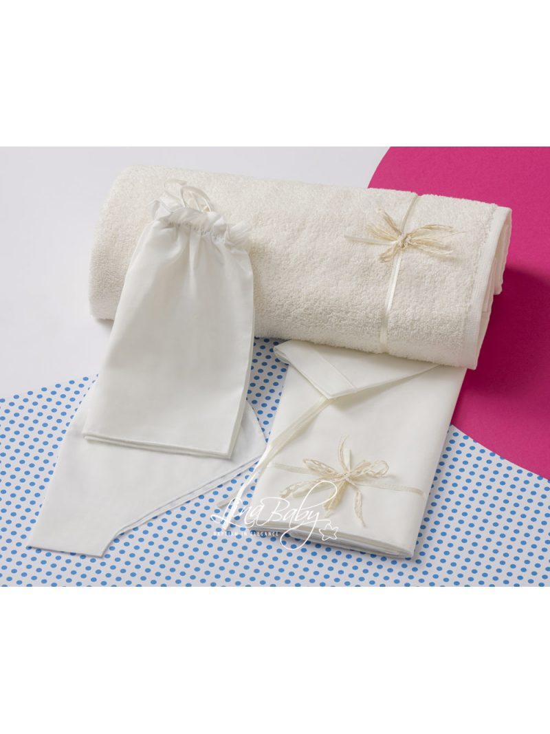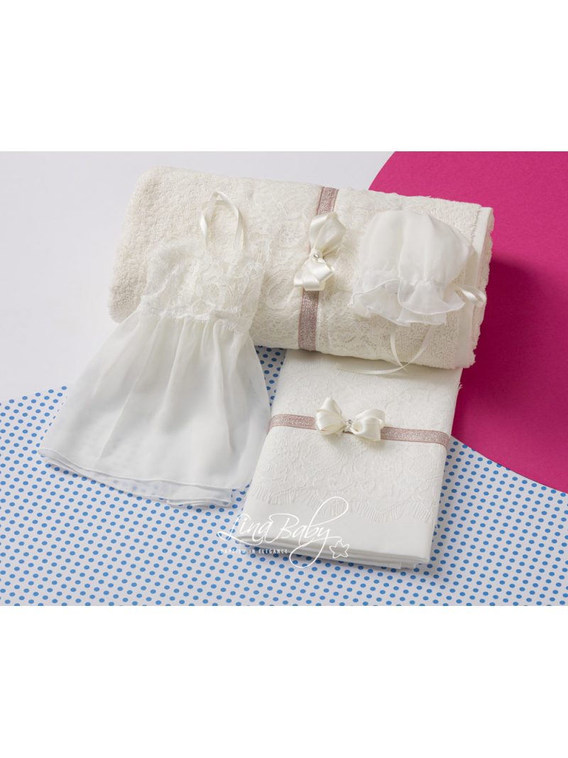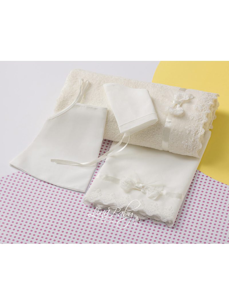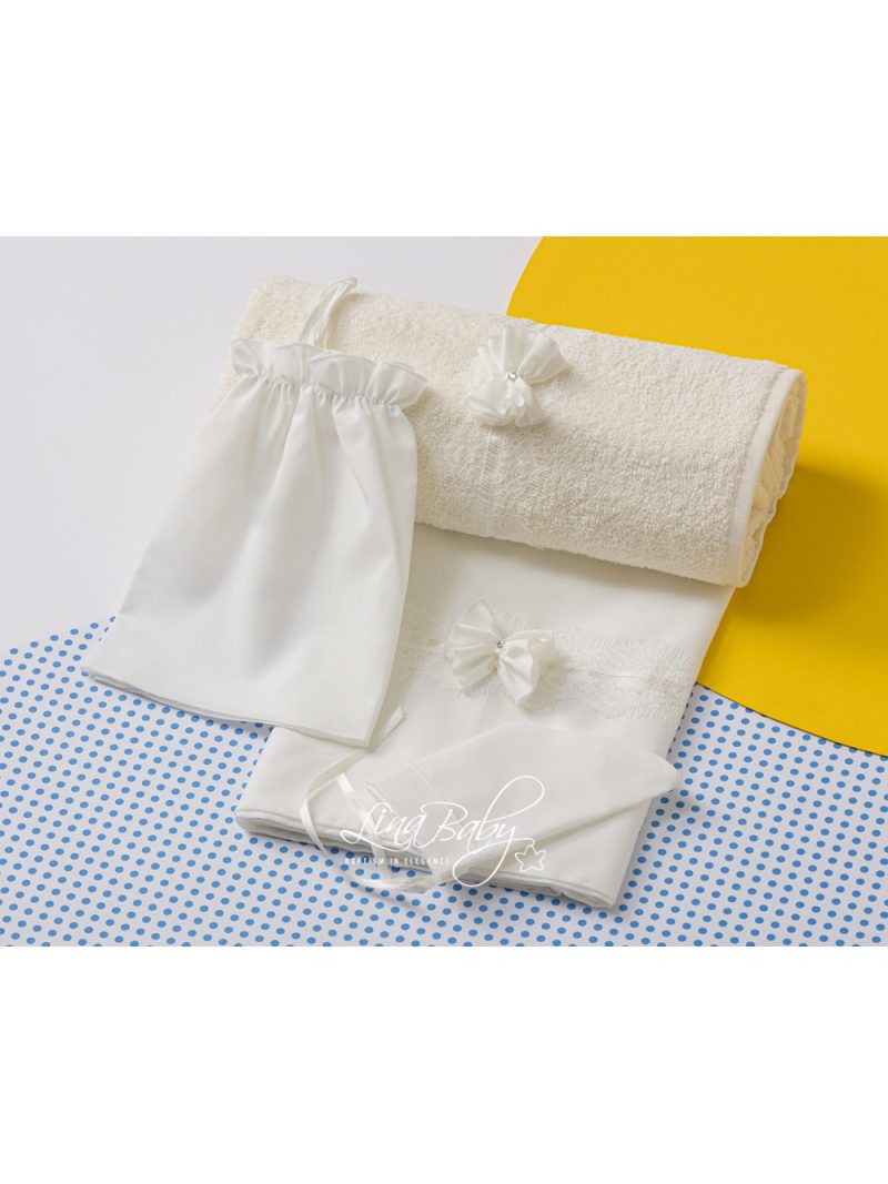 Απλό και φινετσάτο βαμβακερό σετ λαδόπανων σε εκρού χρώμα με τρέσα από γαλλική δαντέλα και σατέν κορδέλα.Στο κέντρο διακοσμείται απο ενα ιδιαίτερο φιογκάκι μουσελίνας και στρασάσκι τύπου swarovski. Πετσέτα 70*140*400gr2. Πετσέτα παπά 30*50*400gr2. Ολες οι πετσέτες της Lina Baby φέρουν την ετικέτα STANDARD 100 by OEKO-TEX® (Αυτό σημαίνει ότι τα προϊόντα δεν περιέχουν επιβλαβή επίπεδα χημικών ουσιών.)