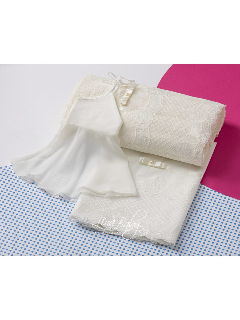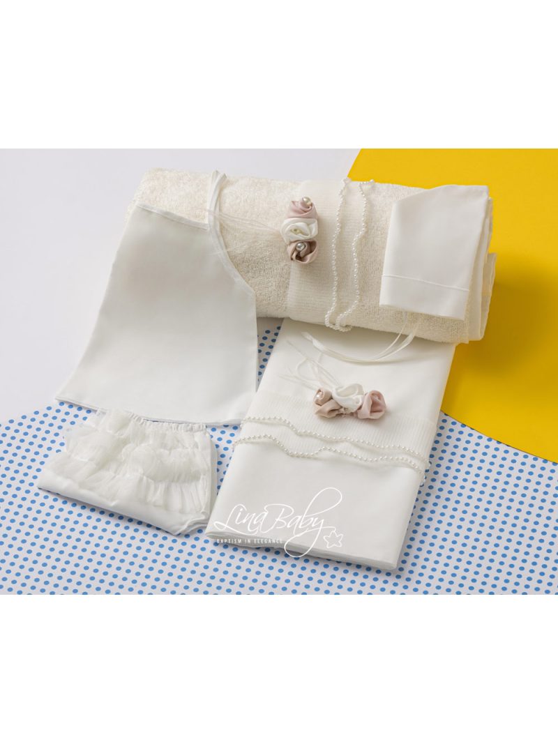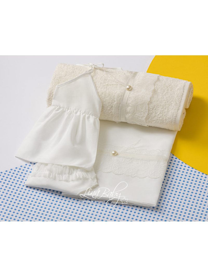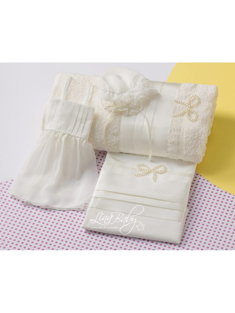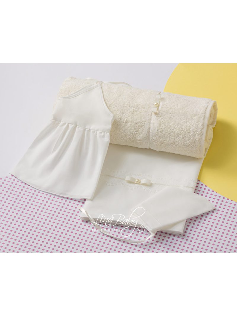 Μοναδικά απλό και κομψό βαμβακερό σετ λαδόπανων σε Ιβουαρ χρώμα με φάσα από Σατέν Duchess ύφασμα. Σατέν γκρό κορδέλα και φιογκάκι φτιαγμένο από πέρλες διακοσμούν την μέση της φάσας του λαδόπανου. Το σετ εσωρούχων είναι απο εξαιρετικής ποιότητας ιταλική μουσελίνα. Πετσέτα 90*140*400gr2 . Πετσέτα παπά 30*50*400gr2. Ολες οι πετσέτες της Lina Baby φέρουν την ετικέτα STANDARD 100 by OEKO-TEX® (Αυτό σημαίνει ότι τα προϊόντα δεν περιέχουν επιβλαβή επίπεδα χημικών ουσιών.)