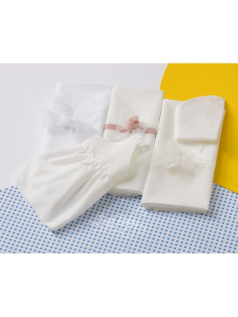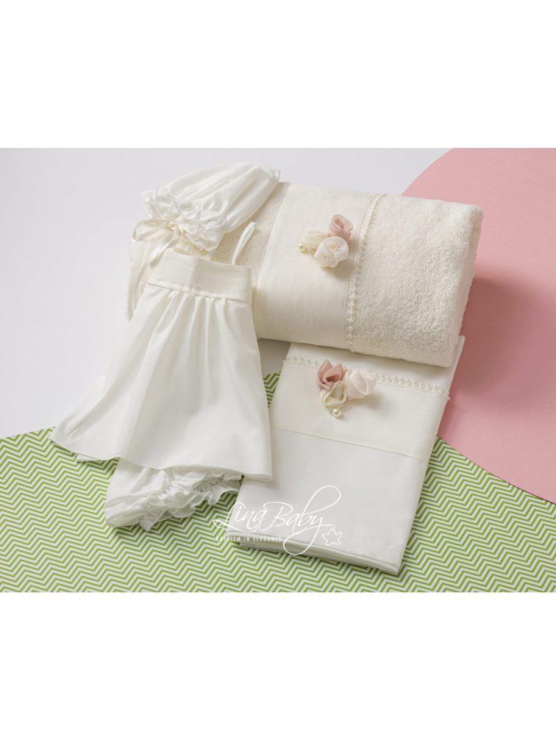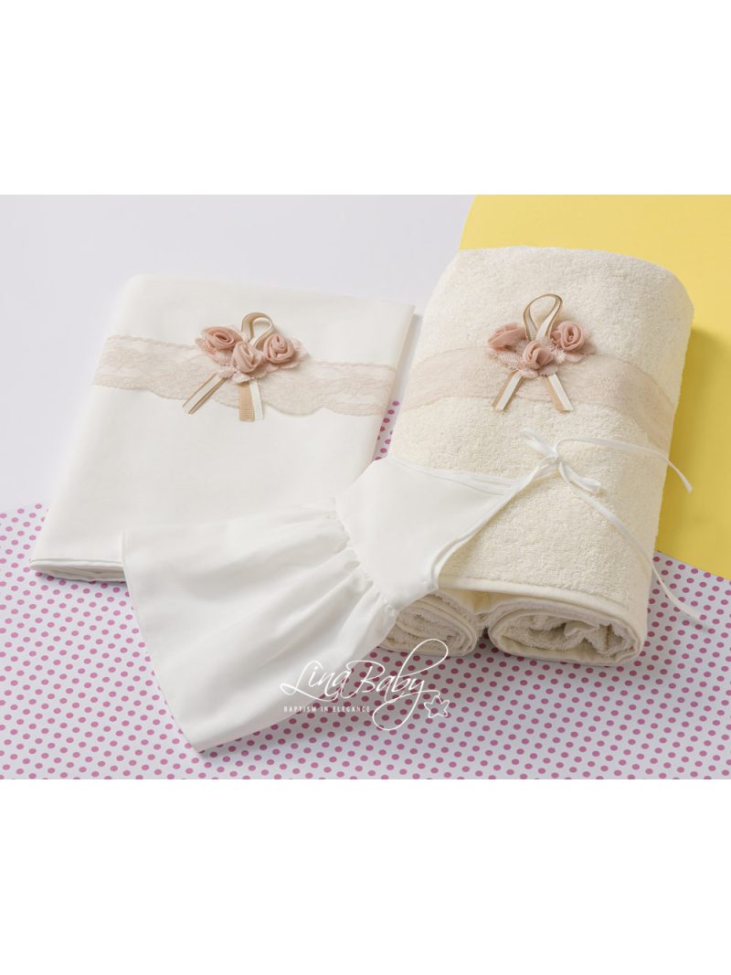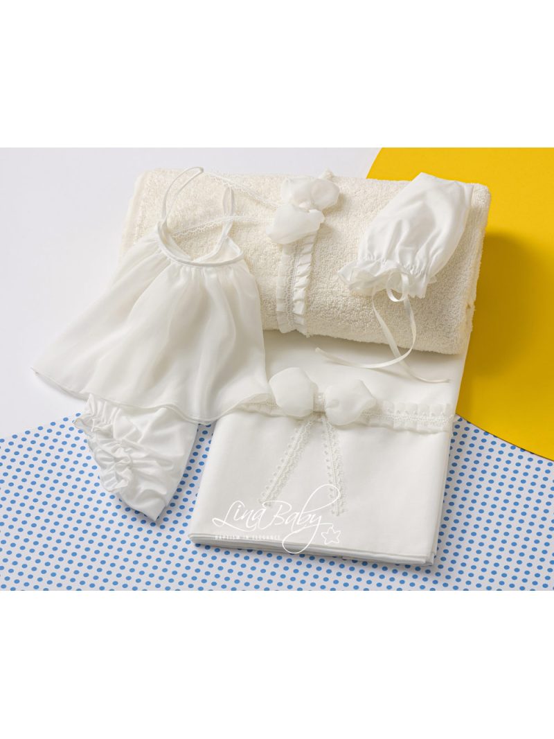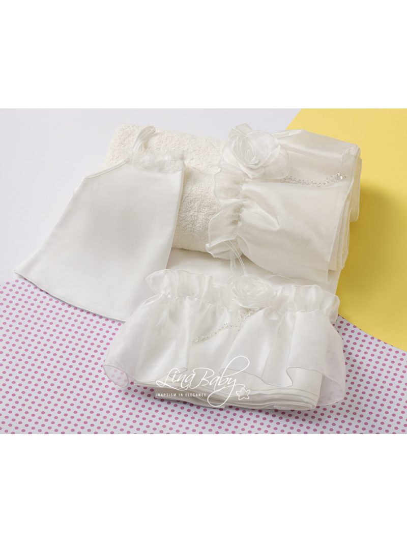 Διαχρονικοτήτα και ποιότητα, σε ένα λαδόπανο. Βαλέρια. Σετ λαδόπανων σε ivory χρώμα με φάσα-βολάν 20 πόντων από οργαντίνα σατινέ. Στο κέντρο του λαδόπανου διακρίνεται ένα εντυπωσιακό τριαντάφυλλο απο οργαντίνα με στρας και φτερά. Πετσέτα 90*140*400gr2. Πετσέτα παπά 30*50*400gr2. Ολες οι πετσέτες της Lina Baby φέρουν την ετικέτα STANDARD 100 by OEKO-TEX® (Αυτό σημαίνει ότι τα προϊόντα δεν περιέχουν επιβλαβή επίπεδα χημικών ουσιών.)