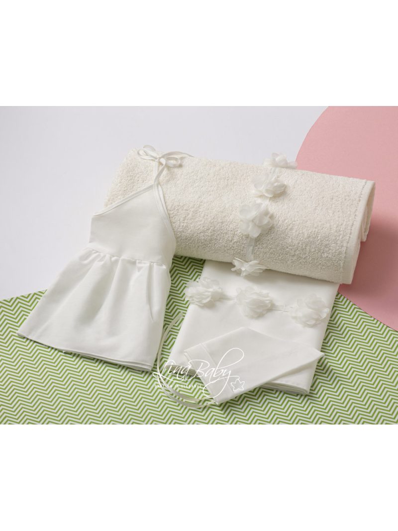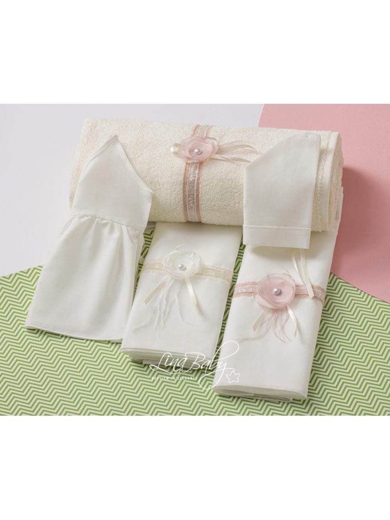 Ρομαντικό βαμβακερό σετ λαδόπανων σε εκρού χρώμα με τρέσα-βολάν από τούλι σε λεπτό πλισέ κ πέρλες στο τελείωμα. Τα χειροποίητα διακοσμητικά λουλούδια από ύφασμα σε 3 αποχρώσεις, μπεζ-σάπιο μήλο-εκρού καθώς και τα φτερά, δίνουν πινελιές χρώματος. Πετσέτα 70*140*400gr2. Πετσέτα παπά 30*50*400gr2. Ολες οι πετσέτες της Lina Baby φέρουν την ετικέτα STANDARD 100 by OEKO-TEX® (Αυτό σημαίνει ότι τα προϊόντα δεν περιέχουν επιβλαβή επίπεδα χημικών ουσιών.)