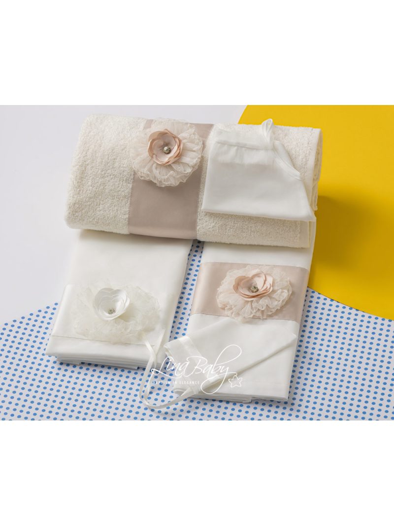 Ρομαντικό βαμβακερό σετ λαδόπανων σε ivory χρώμα με σατέν κορδέλα και σειρά από απλικέ διακοσμητικά λουλούδια. Πετσέτα 70*140*400gr2. Πετσέτα παπά 30*50*400gr2. Ολες οι πετσέτες της Lina Baby φέρουν την ετικέτα STANDARD 100 by OEKO-TEX® (Αυτό σημαίνει ότι τα προϊόντα δεν περιέχουν επιβλαβή επίπεδα χημικών ουσιών.)