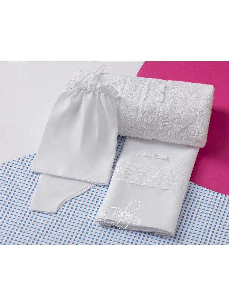 Υπέρκομψο βαμβακερό σετ λαδόπανων σε λευκό χρώμα, με Broderie Anglais Εntredeux τρέσα και βαμβακερή κορδέλα με φιογκάκι και πέρλα. Πετσέτα 70*140*400gr2. Πετσέτα παπά 30*50*400gr2. Ολες οι πετσέτες της Lina Baby φέρουν την ετικέτα STANDARD 100 by OEKO-TEX® (Αυτό σημαίνει ότι τα προϊόντα δεν περιέχουν επιβλαβή επίπεδα χημικών ουσιών.)