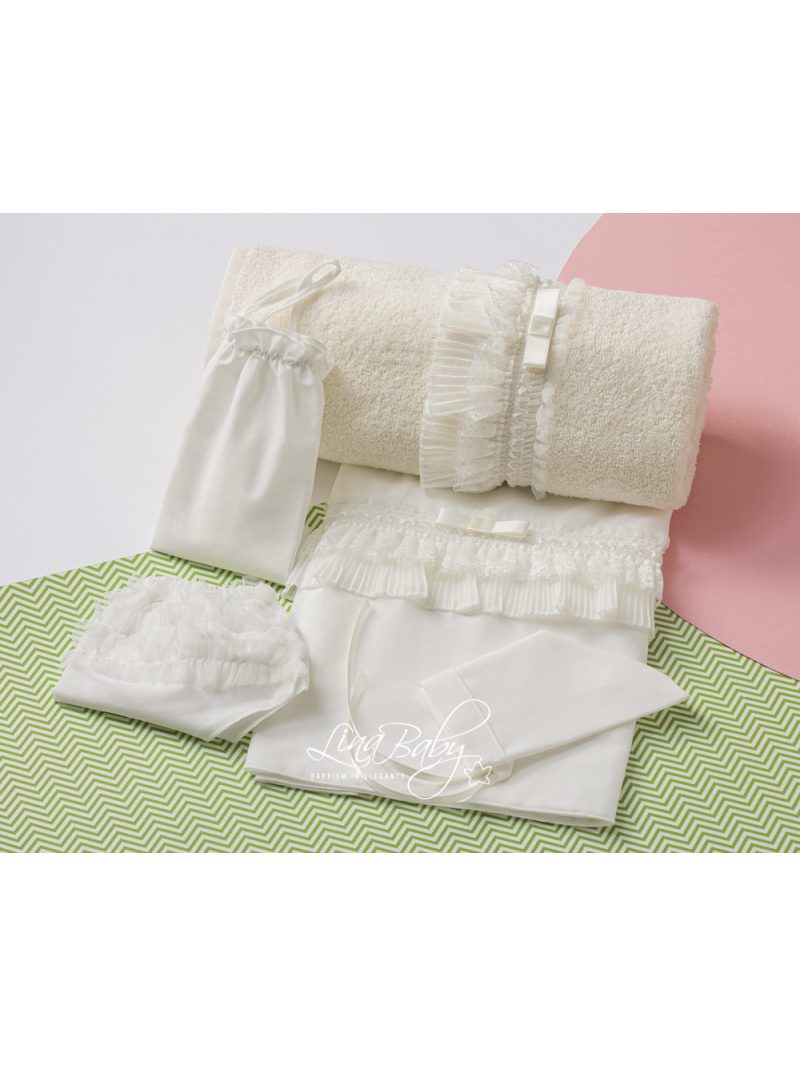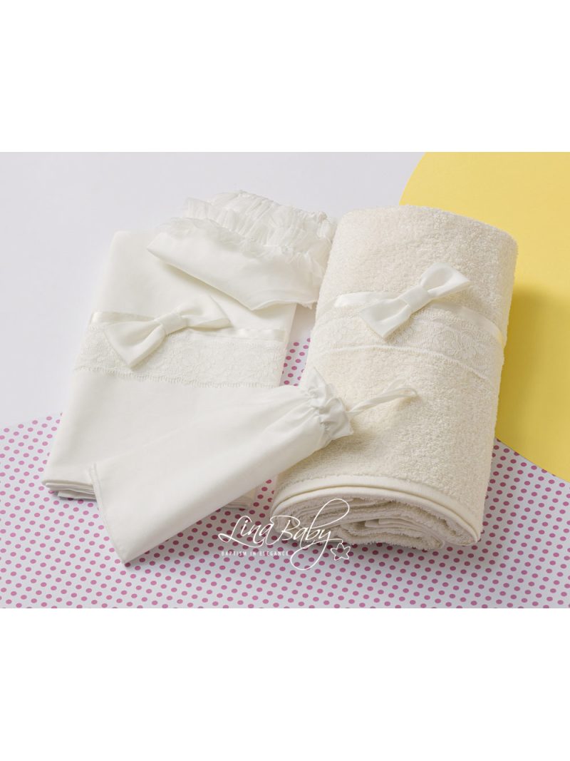 Φινετσάτο βαμβακερό σετ λαδόπανων σε εκρού χρώμα με πλισέ τρέσα υφασμάτινη, δαντέλα τσιγκελάκι και διακοσμητικό φιόγκο από μουσελίνα. Πετσέτα 90*140*400gr2. Πετσέτα παπά 30*50*400gr2. Ολες οι πετσέτες της Lina Baby φέρουν την ετικέτα STANDARD 100 by OEKO-TEX® (Αυτό σημαίνει ότι τα προϊόντα δεν περιέχουν επιβλαβή επίπεδα χημικών ουσιών.)