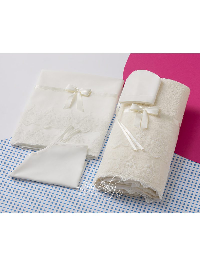 Το ιδανικό σετ λαδόπανων... Με ρομαντική διάθεση ....Διατίθεται σε ιβουαρ χρώμα με δαντέλα στο τελείωμα, σατέν τρέσα και εντυπωσιακό διακοσμητικό φιόγκο από τηη ιδια του την δαντέλα . Πετσέτα 70*140*400gr2. Πετσέτα παπά 30*50*400gr2. Ολες οι πετσέτες της Lina Baby φέρουν την ετικέτα STANDARD 100 by OEKO-TEX® (Αυτό σημαίνει ότι τα προϊόντα δεν περιέχουν επιβλαβή επίπεδα χημικών ουσιών.)