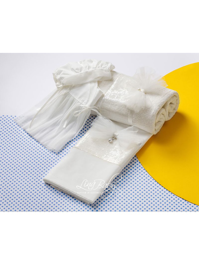 Μοναδικά κομψό βαμβακερό σετ λαδόπανων σε εκρού χρώμα, με διακοσμητική φάσα υφάσματος από Λινό κεντημένο με διάφανες παγιέτες ύφασμα και εντυπωσιακό απλικέ φιόγκο από τούλι και κρεμαστή περλίτσα. Πετσέτα 90*140*450gr2. Πετσέτα παπά 30*50*400gr2. Ολες οι πετσέτες της Lina Baby φέρουν την ετικέτα STANDARD 100 by OEKO-TEX® (Αυτό σημαίνει ότι τα προϊόντα δεν περιέχουν επιβλαβή επίπεδα χημικών ουσιών. )