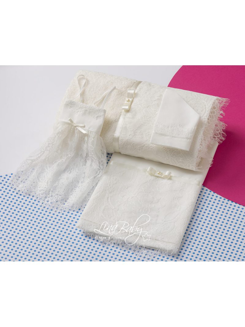 Ρομαντικό και φινετσάτο βαμβακερό σετ λαδόπανων σε εκρού χρώμα με φάσα από γαλλική δαντέλα είκοσι πόντων και σατέν κορδέλα με φίογκο. Πετσέτα 90*140*450gr2. Πετσέτα παπά 30*50*400gr2. Ολες οι πετσέτες της Lina Baby φέρουν την ετικέτα STANDARD 100 by OEKO-TEX® (Αυτό σημαίνει ότι τα προϊόντα δεν περιέχουν επιβλαβή επίπεδα χημικών ουσιών. )
