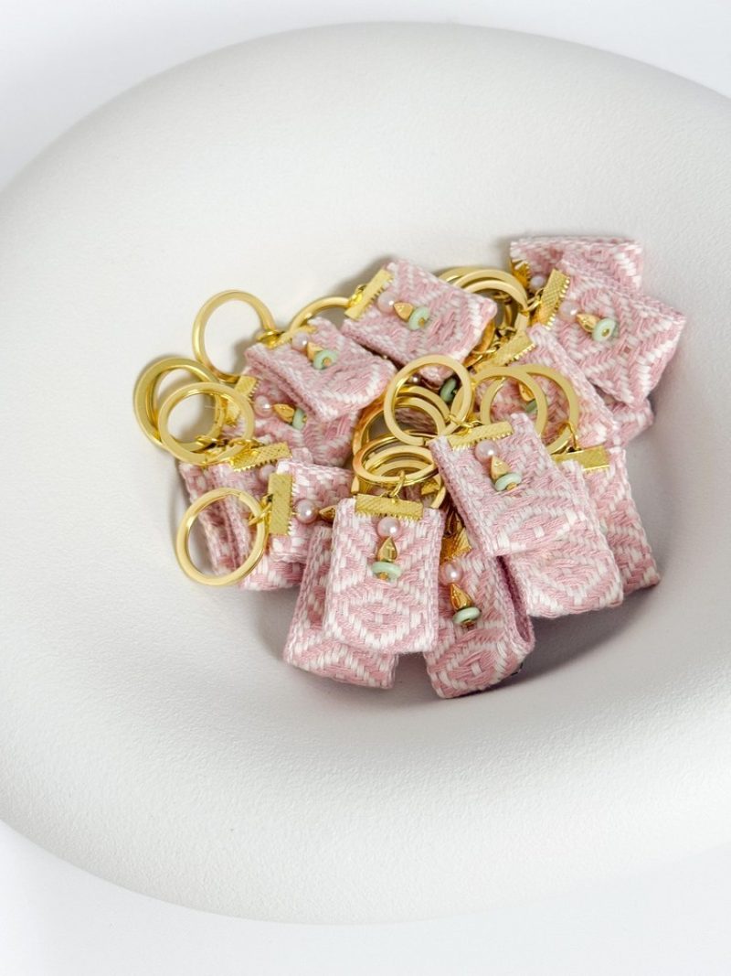Μαρτυρικό μπρελόκ με επιχρυσωμένο σταυρό, χάντρα,πέρλα και ροζ-λευκή τρέσα R44(50τμχ)
