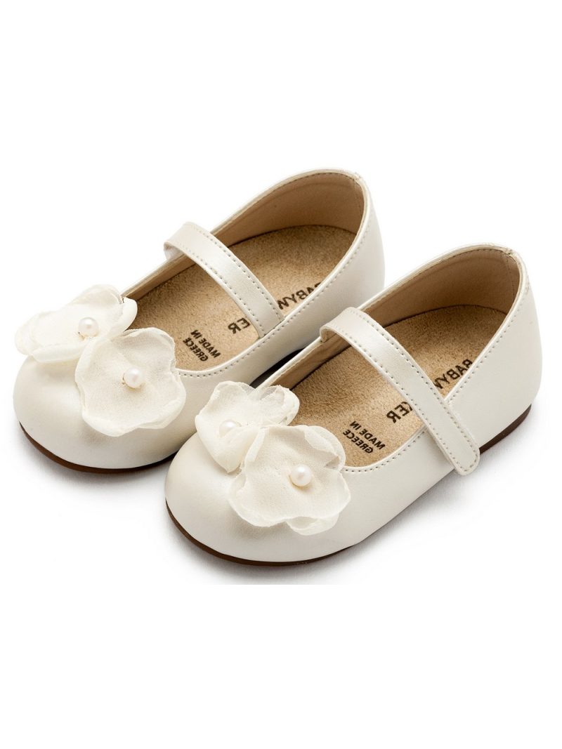 Δερμάτινο Γοβάκι Μονή Μπαρέτα Χρατς με Υφασμάτινα Χειροποίητα Λουλούδια Οργάντζας και Πέρλα σε Εκρού Χρώμα