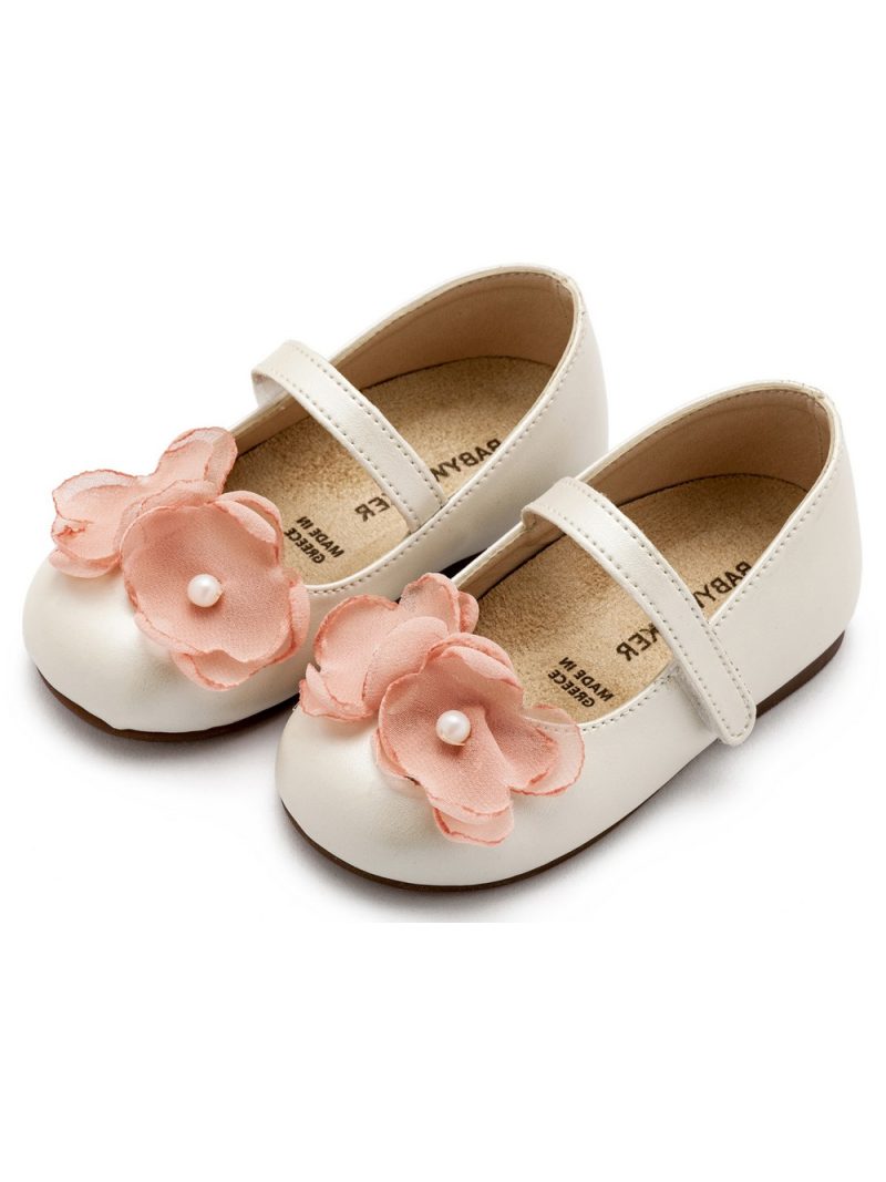 Δερμάτινο Γοβάκι Μονή Μπαρέτα Χρατς με Υφασμάτινα Χειροποίητα Λουλούδια Οργάντζας και Πέρλα σε Εκρού Ροζ Χρώμα