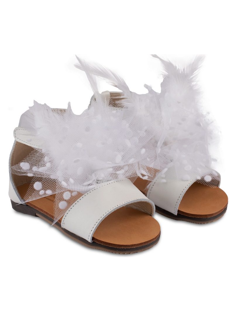 Δερμάτινο Πέδιλο Διακοσμημένο με χειροποίητο Υφασμάτινο Διακοσμητικό με Πουά Τούλι και ΠούπBW4799-IVORY1ουλα σε Εκρού χρώμα