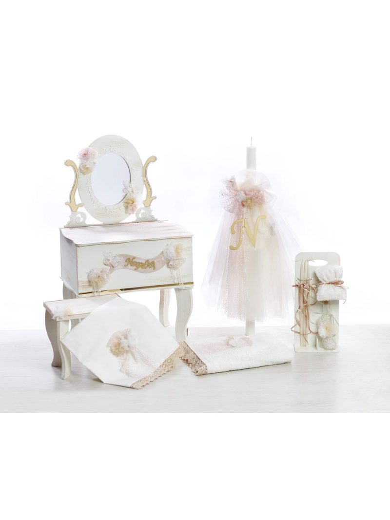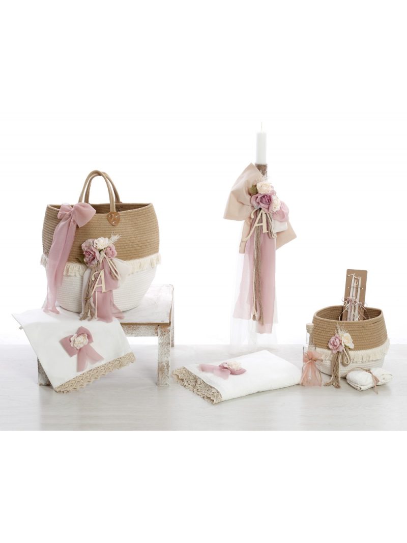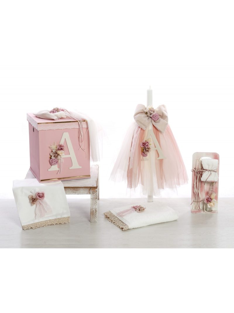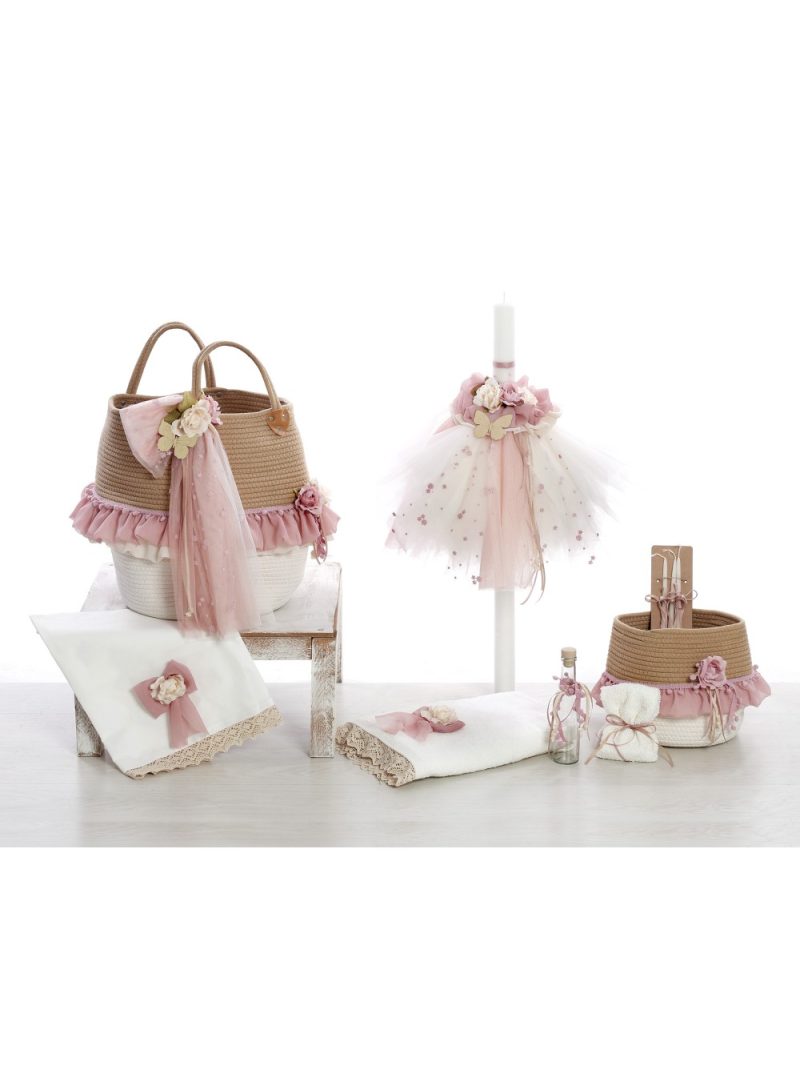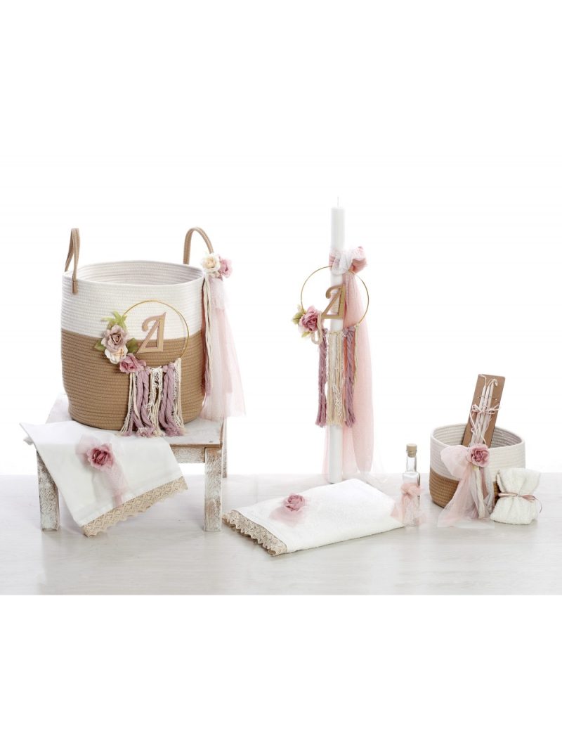 Ολοκληρωμένο βαπτιστικό σετ με μονόγραμμα, διακοσμημένο με υφασμάτινα λουλούδια, τούλια και δαντέλα σε απαλές ροζ και μπεζ αποχρώσεις. Ιδανικό για μια ρομαντική βάπτιση με αριστοκρατικές λεπτομέρειες. Το σετ περιλαμβάνει: