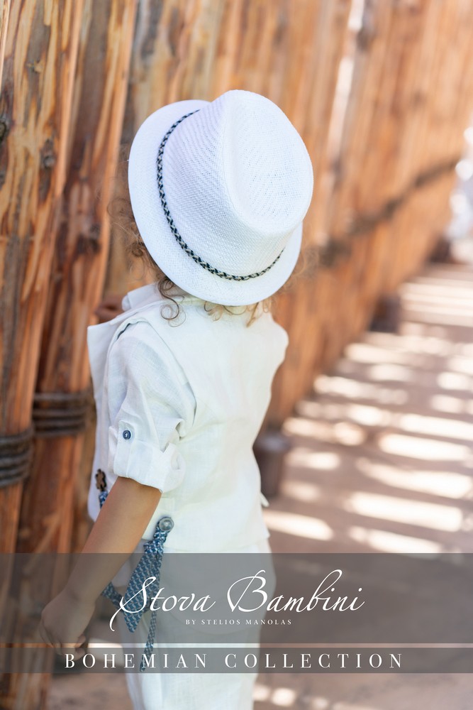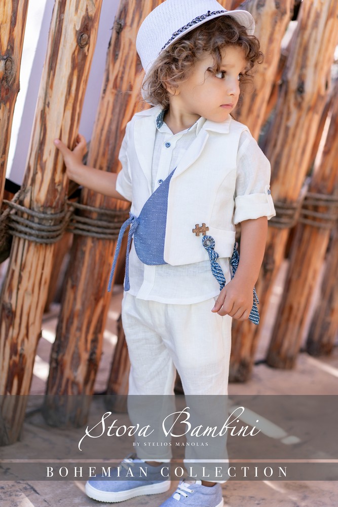 Βαπτιστικό σύνολο για αγόρι από υψηλής ποιότητας 100% Linen. Ένα νέο σταυρωτό γιλέκο σε λευκή απόχρωση με ενσωματωμένη λεπτομέρεια σε μπλε απόχρωση, συνδυασμένο με λινό λευκό παντελόνι με λεπτομέρειες και αξεσουάρ από υψηλής ποιότητας υφάσματα. Το σετ αποτελείται από 6 τεμάχια (γιλέκο, πουκάμισο, παντελόνι, ζώνη, αξεσουάρ, καπέλο).