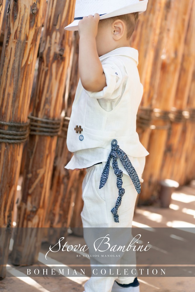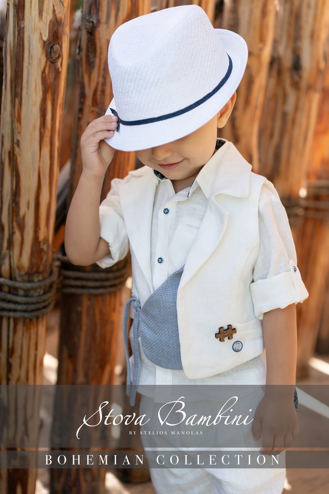 Βαπτιστικό σύνολο για αγόρι από υψηλής ποιότητας 100% Linen. Ένα νέο σταυρωτό γιλέκο σε λευκή απόχρωση με ενσωματωμένη λεπτομέρεια σε σιέλ απόχρωση, συνδυασμένο με λινό λευκό παντελόνι με λεπτομέρειες και αξεσουάρ από υψηλής ποιότητας υφάσματα. Το σετ αποτελείται από 6 τεμάχια (γιλέκο, πουκάμισο, παντελόνι, ζώνη, αξεσουάρ, καπέλο).