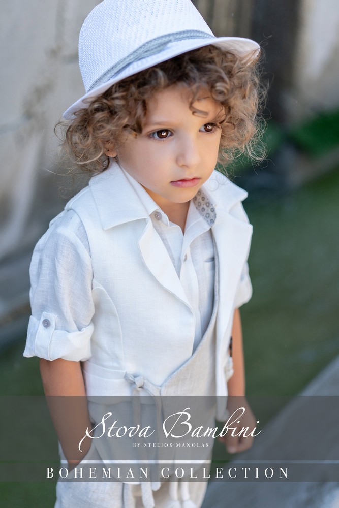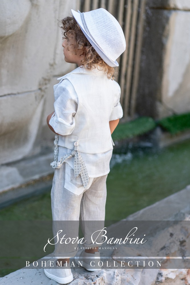 Βαπτιστικό σύνολο για αγόρι από υψηλής ποιότητας 100% Linen. Ένα νέο σταυρωτό γιλέκο σε λευκή απόχρωση με ενσωματωμένη λεπτομέρεια σε μπεζ απόχρωση, συνδυασμένο με λινό μπεζ παντελόνι με λεπτομέρειες και αξεσουάρ από υψηλής ποιότητας υφάσματα. Το σετ αποτελείται από 6 τεμάχια (γιλέκο, πουκάμισο, παντελόνι, κορδόνι περίσφιξης, αξεσουάρ, καπέλο).