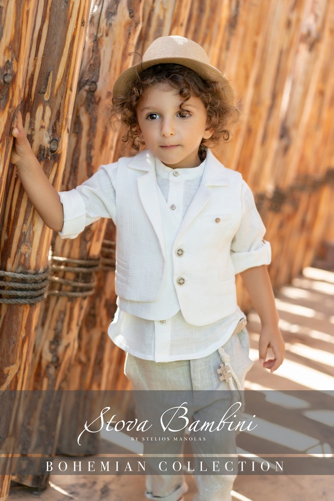 Μοντέρνο βαπτιστικό σύνολο από υψηλής ποιότητας 100% Linen. Ένα νέο διπλό γιλέκο Stova σε λευκή απόχρωση με ενσωματωμένη λεπτομέρεια πέτου σε λευκή απόχρωση, συνδυασμένο με λινό μπεζ παντελόνι με λεπτομέρειες και αξεσουάρ από υψηλής ποιότητας υφάσματα. Το σετ αποτελείται από 6 τεμάχια (γιλέκο, πουκάμισο, παντελόνι, κορδόνι περίσφιξης, αξεσουάρ, καπέλο).