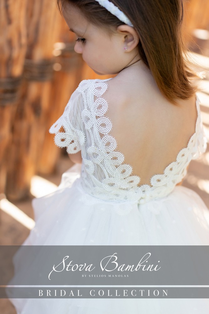 Μοναδικό design στο off-white τούλινο φόρεμα της Bridal συλλογής συνδυασμένο με δαντελένια τρέσα υψηλής αισθητικής και ασύμμετρη τούλινη φούστα. Το βαπτιστικό φόρεμα ολοκληρώνεται με χειροποίητη στέκα μαλλιών διακοσμημένη με μοναδικό υφασμάτινο λουλούδι. Όλα τα φορέματα διαθέτουν εσωτερική επένδυση 100% Cotton.