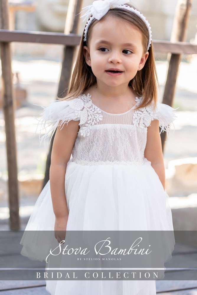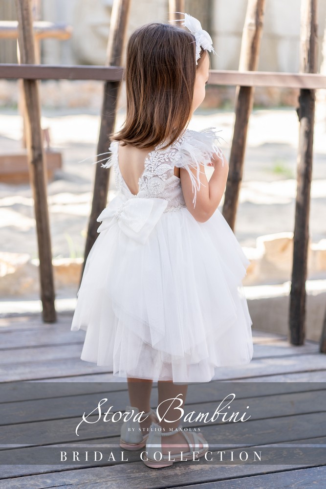 Παραμυθένιο φόρεμα βάπτισης σε off-white απόχρωση με τούλινη ασύμμετρη φούστα, διπλό τούλινο φιόγκο διακοσμημένο με δαντέλα, μανίκια στολισμένα με κεντημένη 3D δαντέλα και φτερά marabou. Το βαπτιστικό φόρεμα ολοκληρώνεται με χειροποίητη στέκα μαλλιών διακοσμημένη με διπλό υπέροχο φιόγκο. Όλα τα φορέματα διαθέτουν εσωτερική επένδυση 100% Cotton.