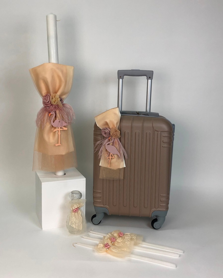 Το Βαπτιστικό σετ περιλαμβάνει (Λαμπάδα, Κουτί ή Βαλίτσα, τρία κεράκια, λαδοσετ με μπουκαλάκι για το λάδι και σαπουνάκι)