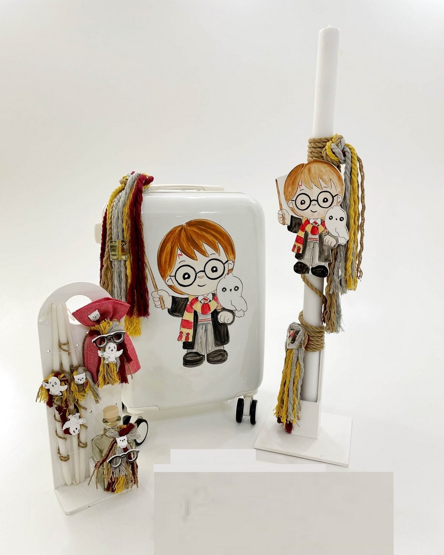 Το Βαπτιστικό σετ περιλαμβάνει (Λαμπάδα, Κουτί ή Βαλίτσα, τρία κεράκια, λαδοσετ με μπουκαλάκι για το λάδι και σαπουνάκι)