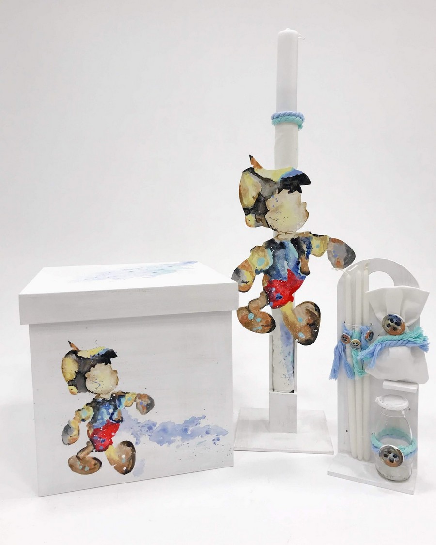 Το Βαπτιστικό σετ περιλαμβάνει (Λαμπάδα, Κουτί ή Βαλίτσα, τρία κεράκια, λαδοσετ με μπουκαλάκι για το λάδι και σαπουνάκι)