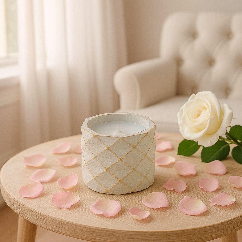 Γεωμετρικό βαζάκι σε λευκό χρώμα που αγκαλιάζει ένα υπέροχο κερί διακοσμημένο με λαμπερές χρυσές λεπτομέρειες. Μια μπομπονιέρα που εκπέμπει κομψότητα και φως!