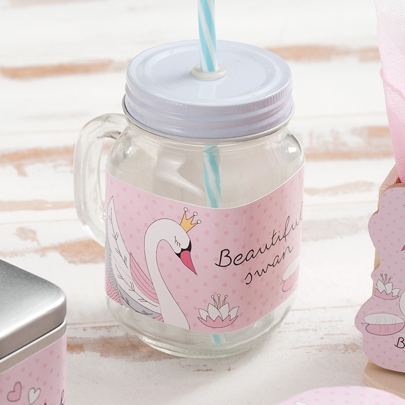 Γυάλινη διάφανη κούπα με λευκό καπάκι και αυτοκόλλητο κύκνος.