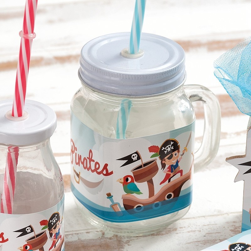 Γυάλινη διάφανη κούπα με λευκό καπάκι και αυτοκόλλητο πειρατής.