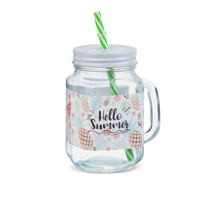 Γυάλινη διάφανη κούπα με λευκό καπάκι και αυτοκόλλητο Hello Summer.