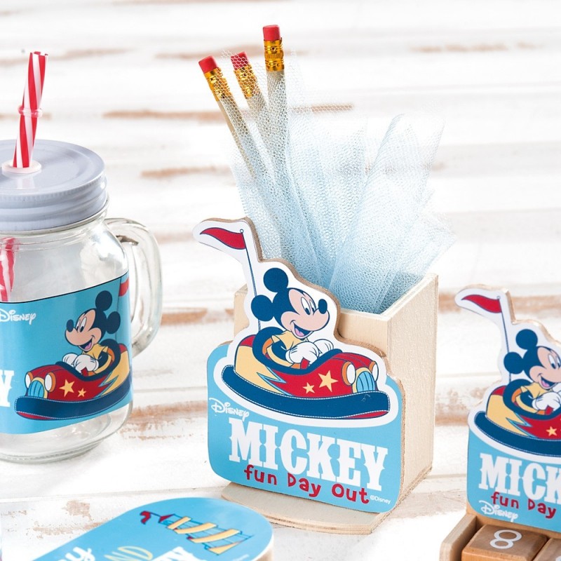 Είναι διακοσμημένο με ξύλινη παράσταση print Mickey Fun Day σε τιρκουάζ-κόκκινες αποχρώσεις.