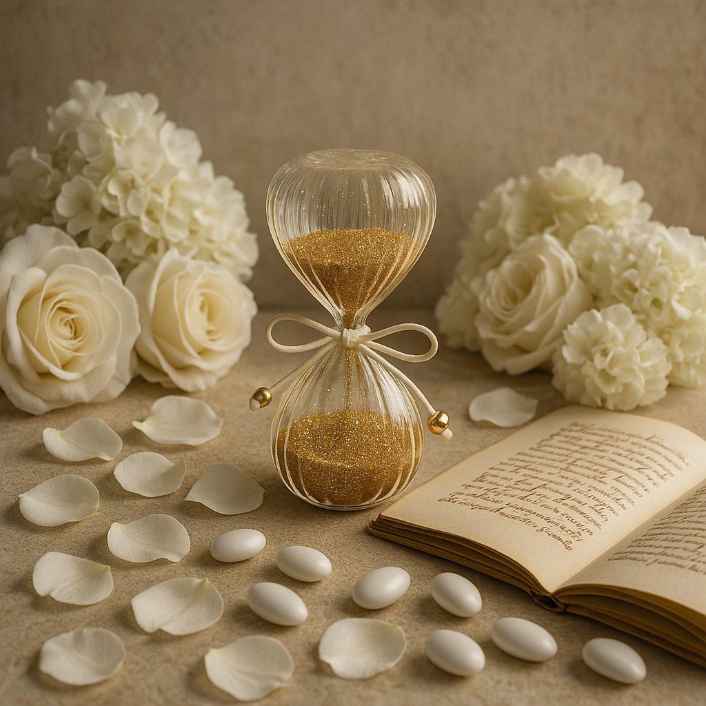 Αυτή η γυάλινη κλεψύδρα με τις λαμπερές χρυσαφένιες λεπτομέρειες που ρέουν σαν αστραφτερή βροχή αποπνέει πολυτέλεια και ρομαντισμό.