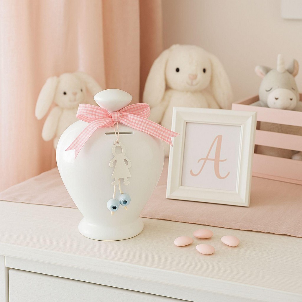 Ένα αξέχαστο δώρο κουμπάρας καλαίσθητα διακοσμημένος με ένα μεταλλικό κορίτσι και ματάκια για καλή τύχη και αποταμίευση.