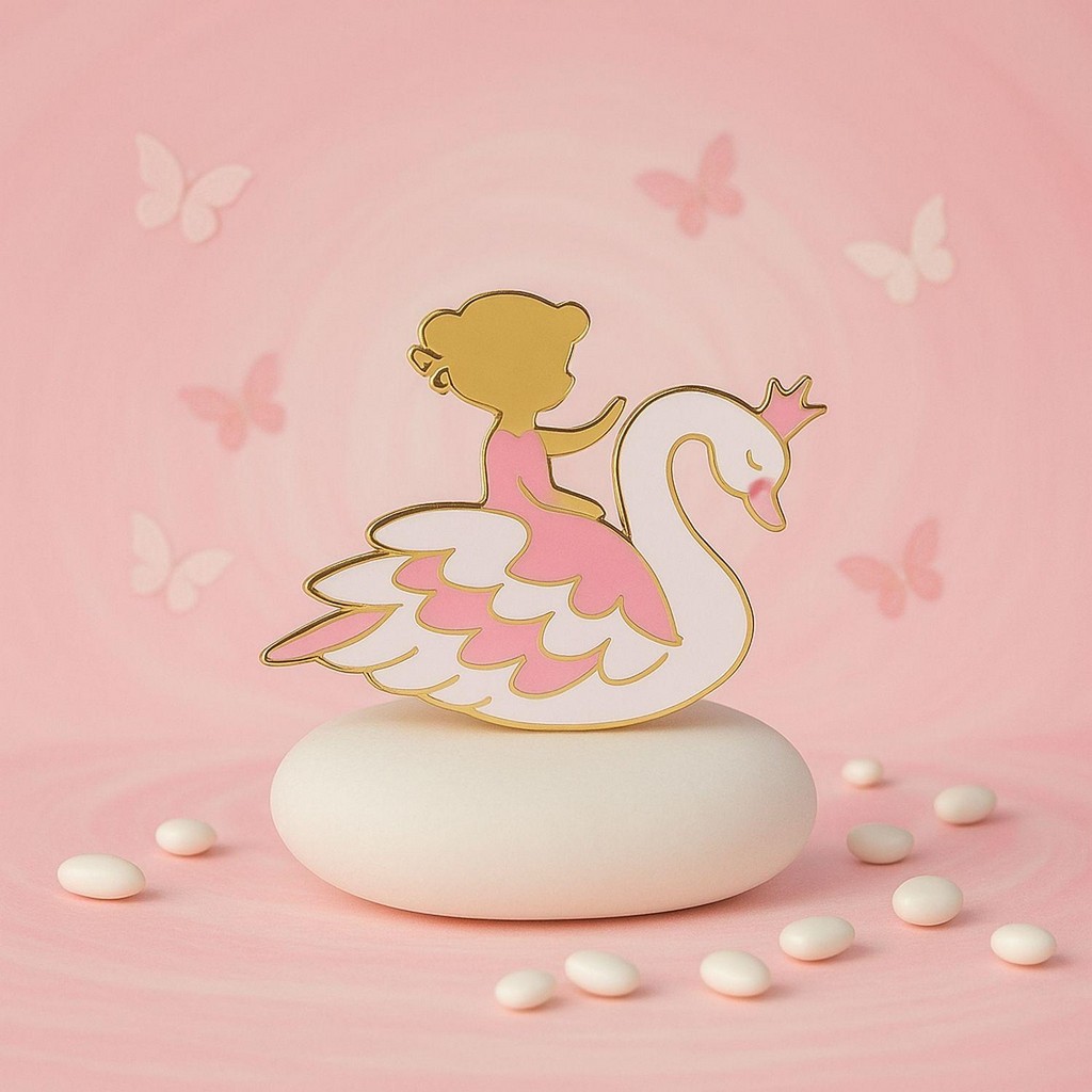 Ονειρεμένη μπομπονιέρα βάπτισης μεταλλικό κορίτσι καθισμένο σε έναν εντυπωσιακό κύκνο πάνω σε λείο βότσαλο σαν να πλέει σε ένα παραμυθένιο ποτάμι.