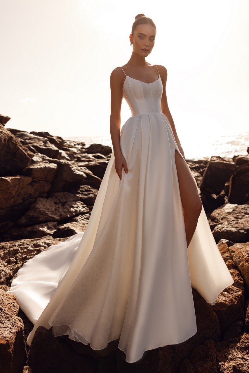 Το Alya είναι ένα φόρεμα που ενσαρκώνει τη μοντέρνα κομψότητα με μια άνετη και γεμάτη αυτοπεποίθηση γραμμή. Το λιτό μπούστο με τις λεπτές τιράντες δημιουργεί ένα κομψό και εκλεπτυσμένο σχήμα, ενώ η φαρδιά φούστα με το τολμηρό σκίσιμο προσθέτει κίνηση και γοητεία. Ο μινιμαλιστικός σχεδιασμός τραβάει την προσοχή στη φυσική ομορφιά της νύφης, αποδεικνύοντας ότι η απλότητα μπορεί να είναι τόσο ισχυρή όσο και οι περίπλοκες λεπτομέρειες. Με κάθε βήμα, η Alya εξισορροπεί τη διαχρονική κομψότητα με ένα φρέσκο, σύγχρονο πνεύμα. Αυτό το φόρεμα δημιουργήθηκε για νύφες που θέλουν να αισθάνονται χαριτωμένες, σίγουρες και αξέχαστες την ημέρα του γάμου τους – μια εμφάνιση που είναι ταυτόχρονα κλασική και εντυπωσιακά μοντέρνα.