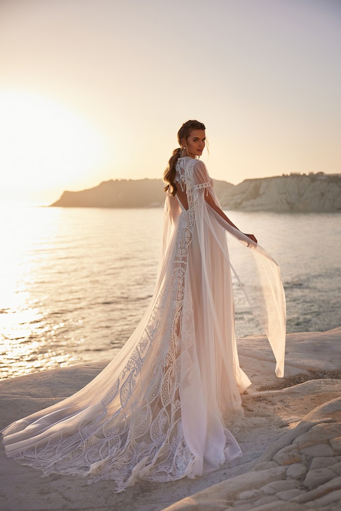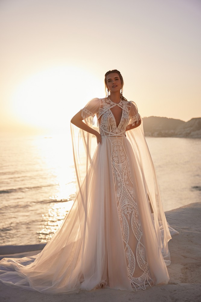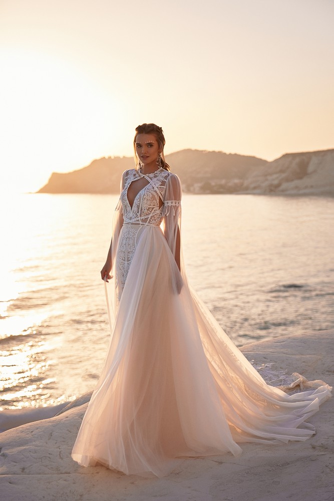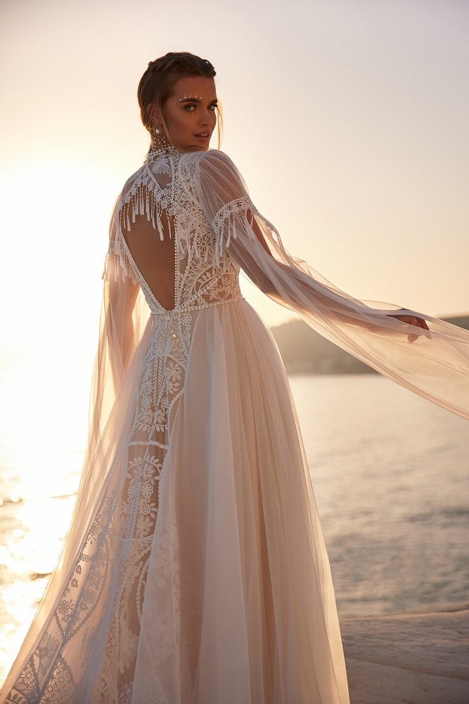 Τα μποέμ νυφικά μας είναι ειδικά κατασκευασμένα για να αναδεικνύουν τον αισθησιασμό, τη θηλυκότητα και την αυτοπεποίθηση. Προσαρμοσμένο για την τολμηρή και δημιουργική μέλλουσα νύφη, το Anwar είναι ένα πολύχρωμο-ρουζ και μπεζ- δραματικό νυφικό με περίτεχνα υφασμένη δαντέλα και λεπτομέρεια με χάντρες σε όλο το μπούστο και στο κέντρο της μακριάς, ρευστής φούστας. Σχεδιασμένο με ντελικάτη φλοράλ δαντέλα και κρόσσια, προσθέσαμε ένα ραμμένο στο χέρι πουλόβερ με φέιγ βολάν από τούλι για να αναδείξουμε την πρωτοτυπία και την τέχνη. Στην DAMA Couture, τα φορέματά μας έχουν σχεδιαστεί με σκοπό να γιορτάσουν την αυτοέκφραση, την αφοσίωση και την ομορφιά μιας γυναίκας.