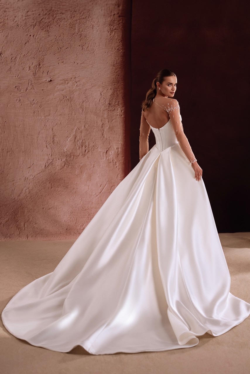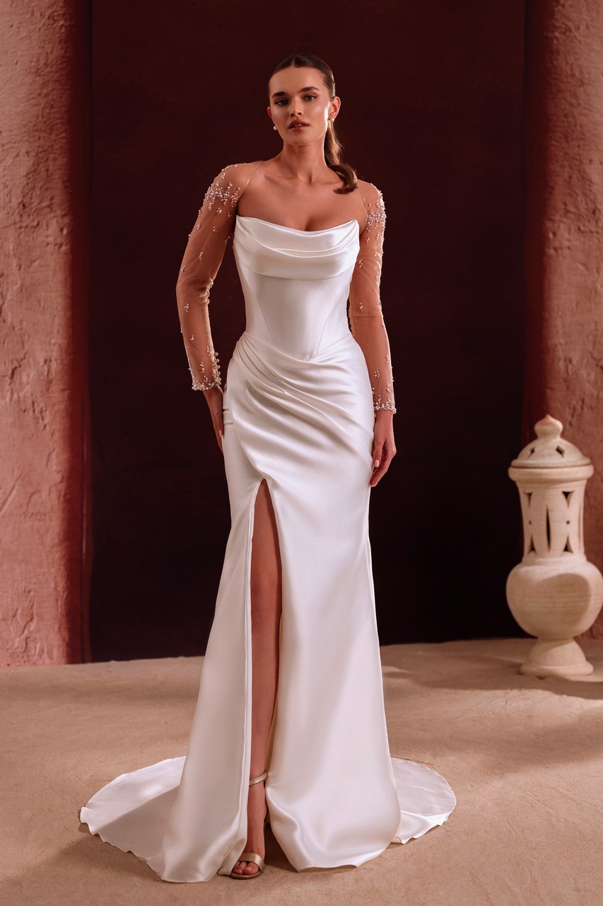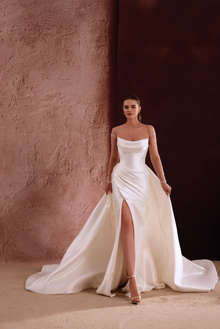 Το Aylin είναι ένα νυφικό που δημιουργήθηκε για νύφες που επιθυμούν κομψότητα με διακριτικές άκρες. Η απαλή σατέν βάση εφαρμόζει όμορφα γύρω από το σώμα, ενώ το απαλό ντραπέ ντεκολτέ προσθέτει διάσταση χωρίς να αφαιρεί την καθαρή σιλουέτα. Τα διάφανα μανίκια, διακοσμημένα με λεπτές πέρλες, δημιουργούν μια πινελιά λάμψης που δίνει μια αίσθηση εκλεπτυσμένης και όχι υπερβολικής. Το μπροστινό σκίσιμο προσθέτει κίνηση και μια νότα τόλμης, καθιστώντας το φόρεμα χαριτωμένο και αξέχαστο. Η αποσπώμενη overskirt δίνει στις νύφες την ελευθερία να επιλέξουν ανάμεσα σε μια κομψή εφαρμοστή εμφάνιση και μια εντυπωσιακή ουρά, προσφέροντας ευελιξία για την τελετή και τον εορτασμό που ακολουθεί.