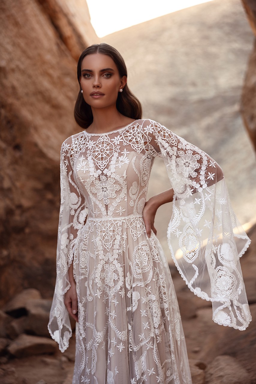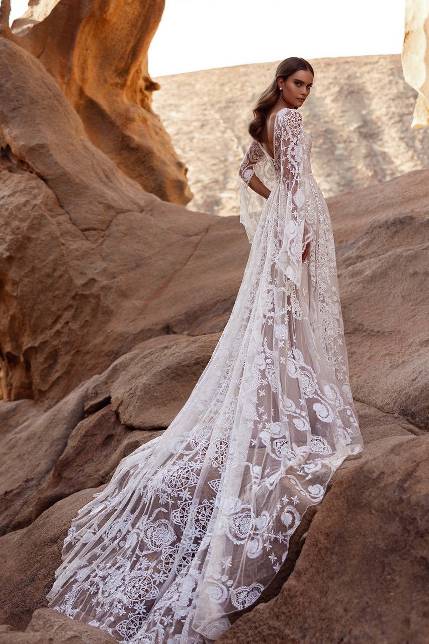 Το Dune είναι ένα νυφικό που απευθύνεται σε νύφες που ονειρεύονται να κάνουν μια δήλωση χωρίς να πουν λέξη. Το φόρεμα χαρακτηρίζεται από την περίτεχνη δαντέλα του, όπου κάθε μοτίβο είναι προσεκτικά τοποθετημένο για να δημιουργήσει βάθος και διάσταση. Τα διάφανα μακριά μανίκια με τις μακριές μανσέτες δίνουν στο φόρεμα μια αίσθηση ελευθερίας και καλλιτεχνίας, ενώ το εφαρμοστό μπούστο αναδεικνύει τη μέση πριν μετατραπεί σε μια μακριά φούστα με μια εντυπωσιακή ουρά. Από κάθε γωνία, το φόρεμα μοιάζει με αριστούργημα — συνδυάζοντας το μποέμικο πνεύμα με την αναμφισβήτητη κομψότητα.