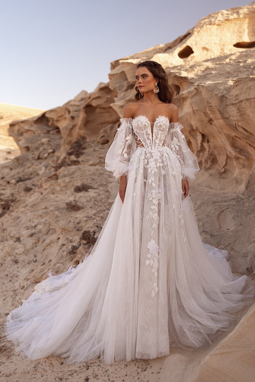Το φόρεμα Huda είναι φτιαγμένο για νύφες που θέλουν ένα φόρεμα που να δίνει μια δυναμική αλλά και ρομαντική αίσθηση. Ο δομημένος κορσές με το εκτεθειμένο τελείωμα σμιλεύει τη μέση, ενώ τα μανίκια με τους έξω ώμους σε σχήμα φουσκωτού στελέχους προσδίδουν απαλότητα και κίνηση. Οι λεπτομέρειες από δαντέλα και τα φλοράλ απλικέ δημιουργούν βάθος σε όλο το μπούστο και ρέουν άψογα σε μια ανάλαφρη φούστα. Μια μακριά, διάφανη ουρά ολοκληρώνει το look, προσθέτοντας μια αίσθηση δράματος χωρίς να χάνει την άνεση. Το Huda είναι η ιδανική επιλογή αν ψάχνετε για ένα νυφικό που θα κάνει τη διαφορά από τη στιγμή που θα μπείτε στο δωμάτιο.