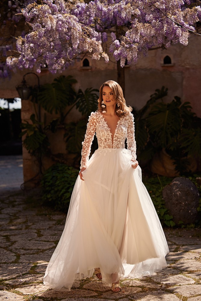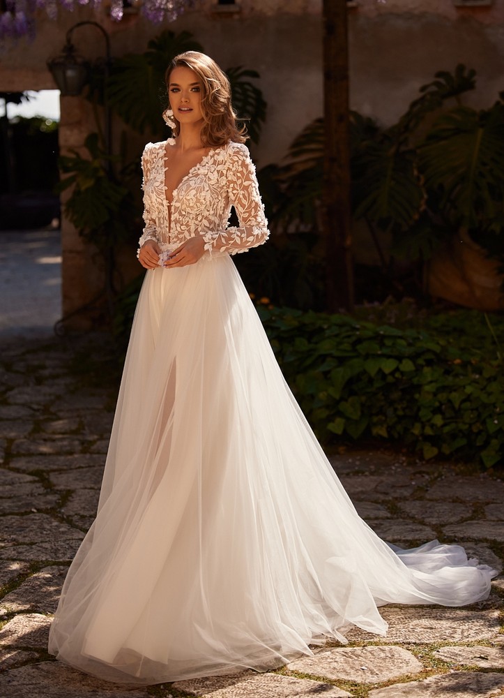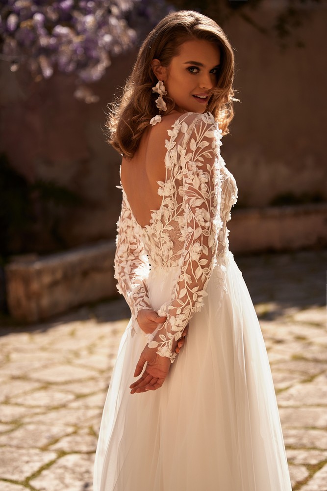 Επικεντρωμένοι στην αυθεντικότητα και τη δημιουργικότητα, οι τεχνίτες μας κατασκεύασαν αυτό το ρομαντικό νυφικό για να αναδείξουν την δυναμική, κομψή και εκφραστική μέλλουσα νύφη! Με μια λεπτή λαιμόκοψη σε σχήμα V και μια μερικώς αποκαλυπτική πλάτη σε στυλ σέσουλα, αυτό το φόρεμα συνδυάζει τη χάρη με τη σαγηνεία. Με μπούστο και μακριά μανίκια εξ ολοκλήρου διακοσμημένα με προσαρμοσμένες λεπτομέρειες από δαντέλα με τρισδιάστατη φλοράλ στάμπα, το φόρεμα Ida είναι προσαρμοσμένο για τον εσωτερικό ρομαντικό σας! Αυτό το μινιμαλιστικό αλλά τολμηρό στυλ αναδεικνύει την τάξη, την αυτοπεποίθηση και την πολυπλοκότητα. Δημιουργημένο από τούλι ραμμένο στο χέρι, συνδυάσαμε ένα τρένο καταρράκτη με μια λεπτή σχισμή στο πλάι. Στη DAMA Couture, είμαστε αφοσιωμένοι στον ειλικρινή και σκόπιμο σχεδιασμό.
