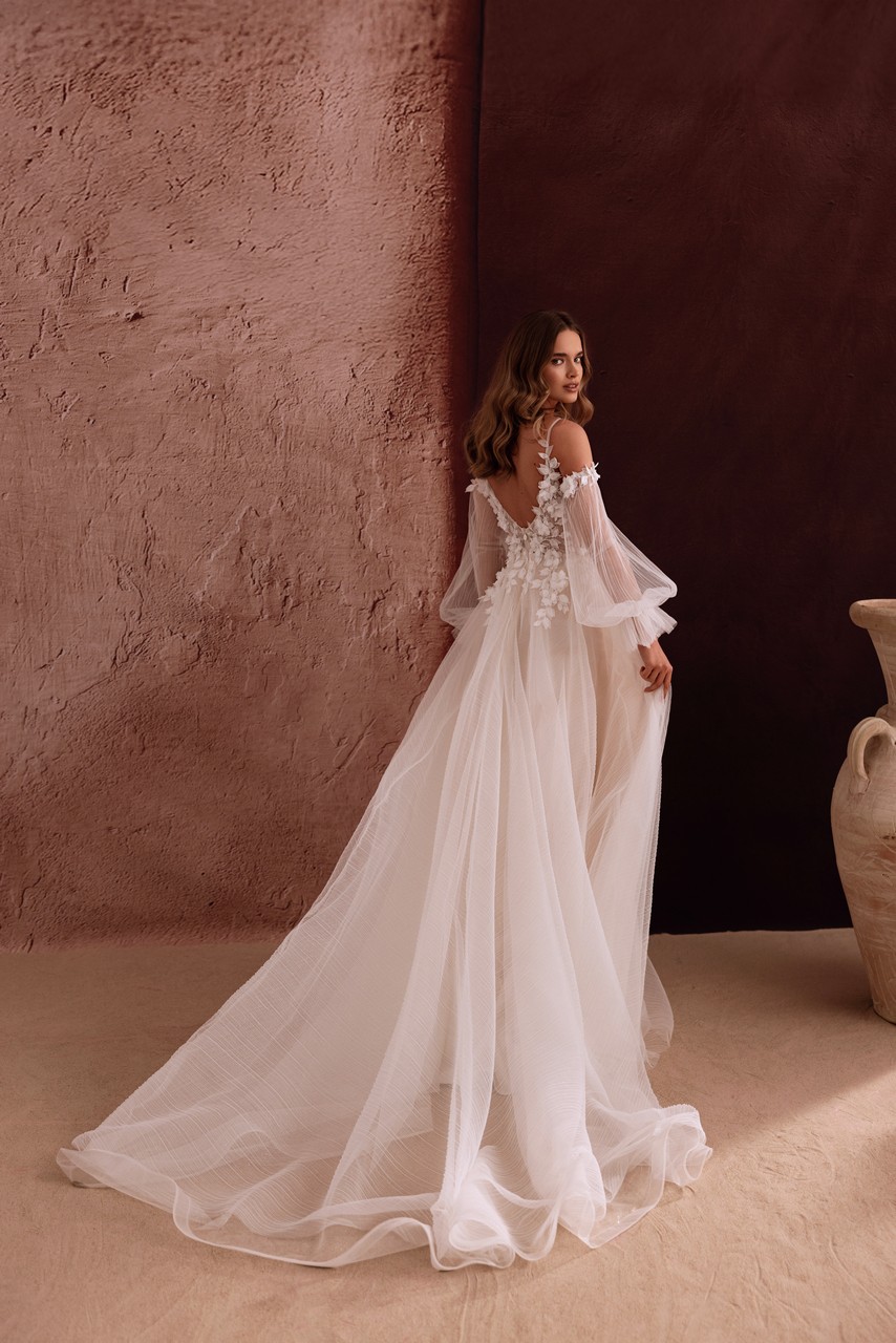 Το φόρεμα Lilibeth έχει σχεδιαστεί για νύφες που ονειρεύονται ρομαντισμό και θέλουν κάθε λεπτομέρεια του φορέματός τους να είναι ξεχωριστή. Το εφαρμοστό μπούστο είναι διακοσμημένο με τρισδιάστατα φλοράλ απλικέ που δημιουργούν μια λεπτή μετάβαση στην απαλή, ρέουσα φούστα. Τα διαφανή, αποσπώμενα μανίκια σε σχήμα φουσκωτού προσθέτουν μια πινελιά δράματος, δίνοντάς σας την ελευθερία να αλλάζετε την εμφάνισή σας όλη την ημέρα. Η βαθιά λαιμόκοψη και οι ανοιχτοί ώμοι ισορροπούν τη θηλυκότητα με την αυτοπεποίθηση, καθιστώντας αυτό το φόρεμα αξέχαστο από την τελετή μέχρι τη δεξίωση.