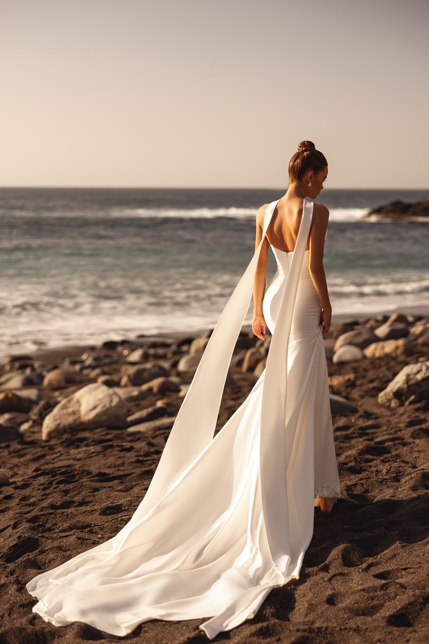 Το φόρεμα Luna δημιουργήθηκε για νύφες που θέλουν μια καθαρή, εντυπωσιακή εμφάνιση χωρίς περιττές λεπτομέρειες. Το ντεκολτέ χωρίς τιράντες με το απαλά διπλωμένο άκρο δίνει στο φόρεμα δομή, ενώ η εφαρμοστή σιλουέτα ακολουθεί τις φυσικές γραμμές του σώματος. Μια απαλή φούστα ρέει προς τα κάτω και εκτείνεται σε μια εντυπωσιακή ουρά, που ολοκληρώνεται με μακριές τιράντες που κινούνται με χάρη σε κάθε βήμα. Είναι ένα φόρεμα που δίνει μια δυναμική και εκλεπτυσμένη αίσθηση, ιδανικό για νύφες που θέλουν μια σίγουρη και αξέχαστη εμφάνιση.