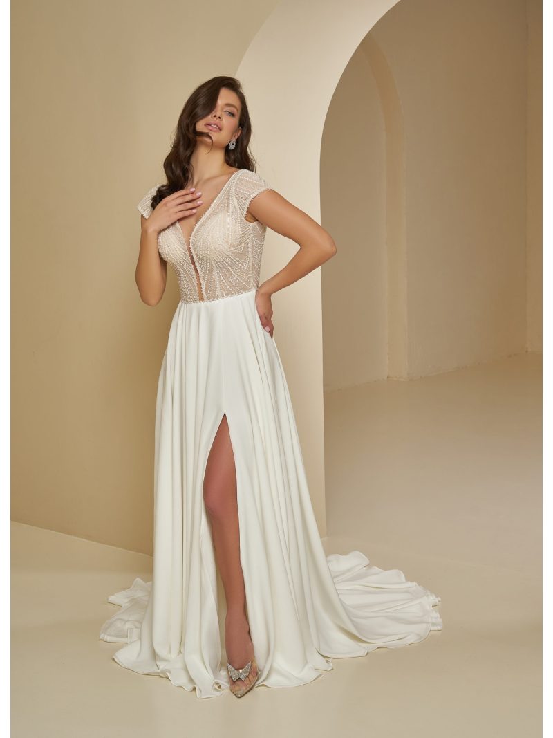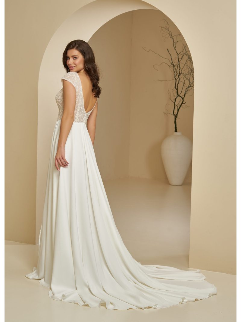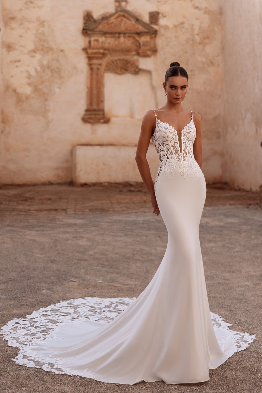 Το φόρεμα Munira είναι μια εκπληκτική επιλογή για νύφες που θέλουν μια κομψή σιλουέτα με εντυπωσιακές λεπτομέρειες. Η εφαρμοστή κρεπ φούστα ρέει άψογα σε μια ουρά μέχρι το παρεκκλήσι, με περίτεχνες δαντελένιες απλικέ που δημιουργούν ένα εκπληκτικό εφέ από πίσω. Το μπούστο διαθέτει διαφανή πάνελ διακοσμημένα με λεπτή δαντέλα, προσφέροντας δομή και απαλότητα, ενώ παράλληλα αναδεικνύουν τη φυσική γραμμή της μέσης. Οι λεπτές τιράντες προσθέτουν ελαφρότητα και ισορροπία, δίνοντας στο φόρεμα μια μοντέρνα αλλά και ρομαντική εμφάνιση. Αυτό το φόρεμα έχει σχεδιαστεί για τη νύφη που εκτιμά την διαχρονική απλότητα, αλλά θέλει ένα φόρεμα που ξεχωρίζει σε κάθε φωτογραφία, από την βόλτα στον διάδρομο μέχρι τον τελικό χορό.