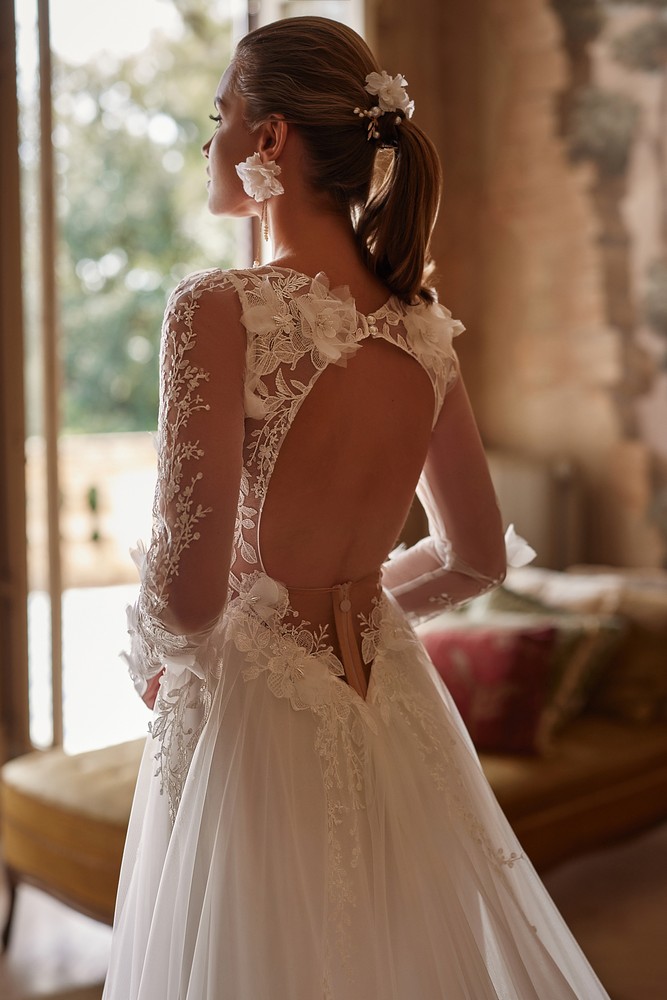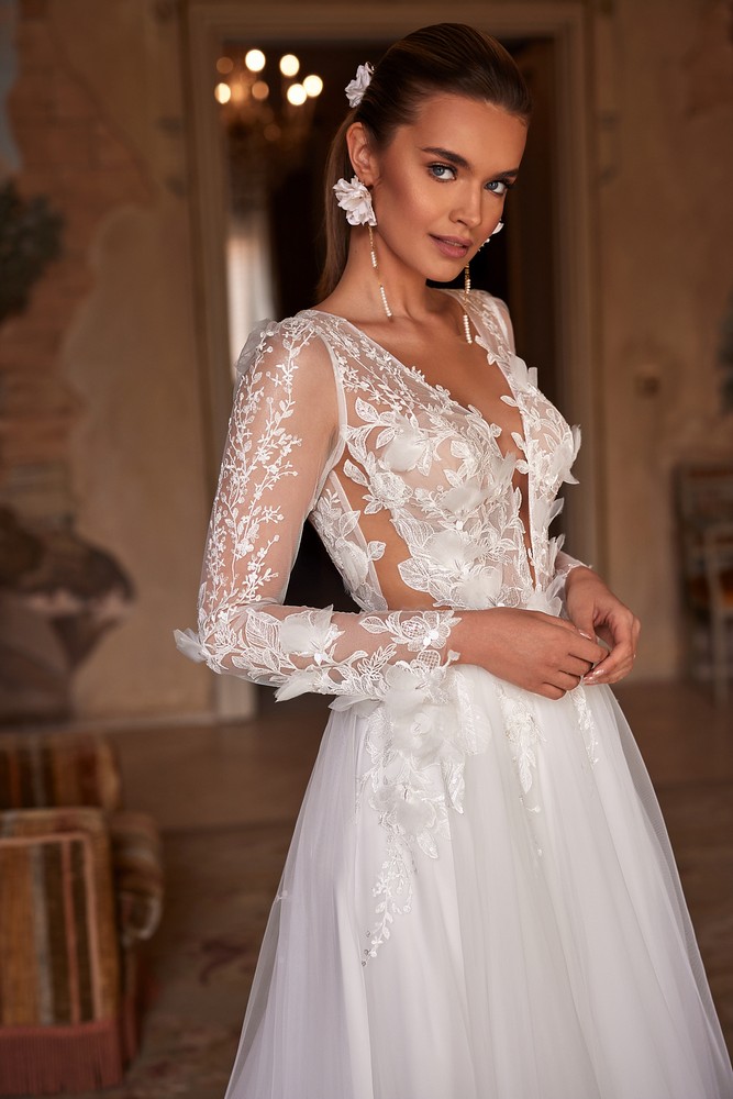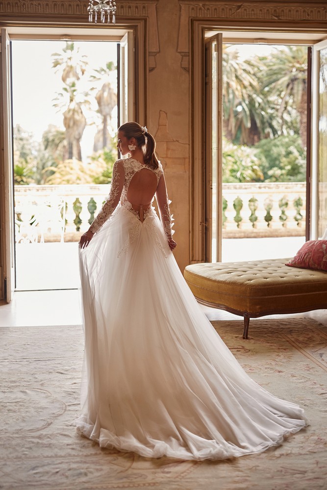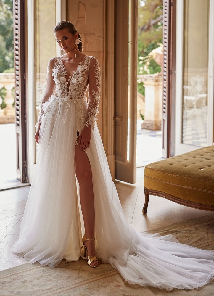 Το φόρεμα Octavia ενσαρκώνει μια κομψή, δυναμική και μοντέρνα μέλλουσα νύφη. Μαζί με μια βαθιά λαιμόκοψη σε σχήμα V και πλάγια κοψίματα, προσθέσαμε μια αποκαλυπτική πλάτη σε στυλ σέσουλα, σχεδιασμένη με ένα λεπτό κλείσιμο με κουμπί στο επάνω μέρος για μια προσαρμοσμένη και εκλεπτυσμένη εμφάνιση. Αυτό το αισθησιακό στυλ τονίζει τη γυναικεία ομορφιά, τη θηλυκότητα και την έκφραση. Προσαρμοσμένα για να τονίσουμε την τέχνη και την προσοχή, διακοσμήσαμε το μπούστο και εφαρμόσαμε διαφανή μακριά μανίκια με ραμμένη στο χέρι δαντέλα με τρισδιάστατα σχέδια. Με γνώμονα τον ρομαντισμό, συνδυάσαμε μια πολυεπίπεδη υφαντή φούστα από τούλι με ένα παράκεντρο ψηλό σκίσιμο για να χορεύει η νύφη όλη τη νύχτα! Στη DAMA Couture, τα νυφικά μας έχουν δημιουργηθεί για να αποπνέουν αυτοπεποίθηση, τάξη και κομψότητα.