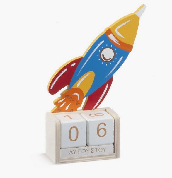 Ξύλινο natural ημερολόγιο με δυνατότητα αλλαγής της ημερομηνίας προσαρμόζοντας τα κυβάκια. Είναι διακοσμημένο με ξύλινη παράσταση πολύχρωμος πύραυλος.
