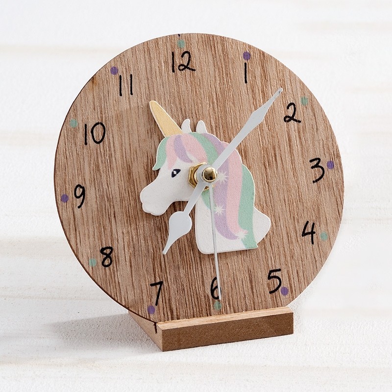 Ξύλινο natural ρολόι μπαταρίας με σχέδιο μονόκερο στο κέντρο σε λευκή απόχρωση με πολύχρωμη χαίτη. Ιδανικό και ως δώρο