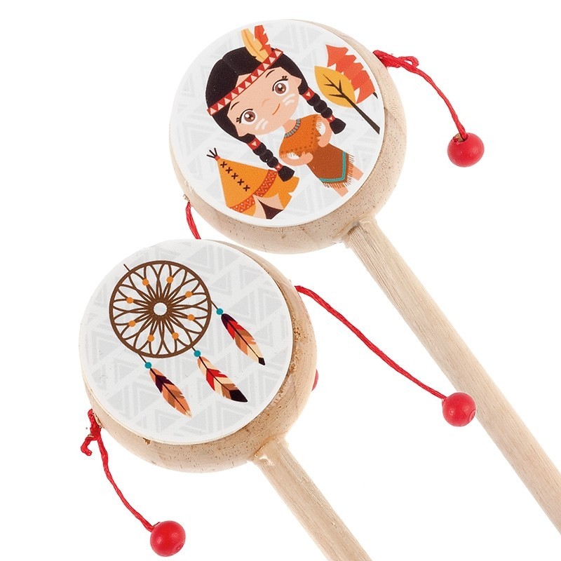 Ξύλινο natural τυμπανάκι με αυτοκόλλητο print ινδιάνα με διαφορετικό σχέδιο μπρος-πίσω.
