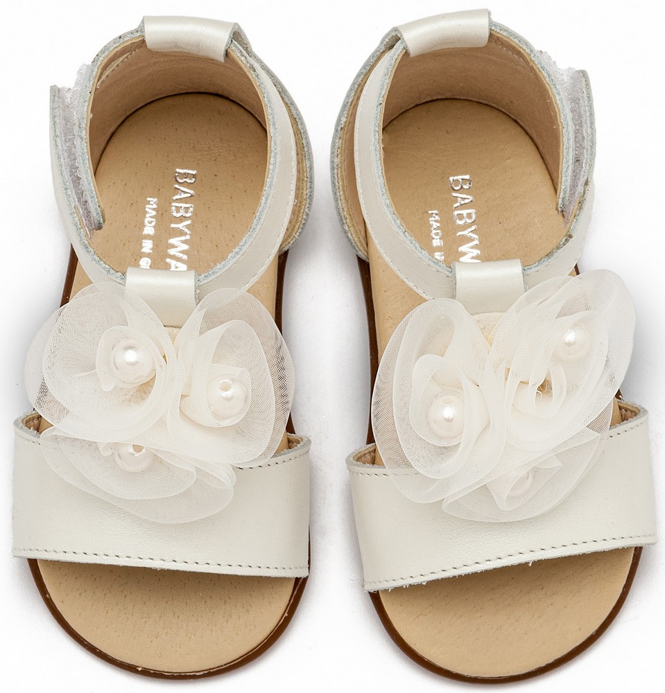 Δερμάτινο Πέδιλο Διακοσμημένο με Λουλούδια Chiffon και Πέρλες απο Δέρμα Πέρλα σε Εκρού Χρώμα